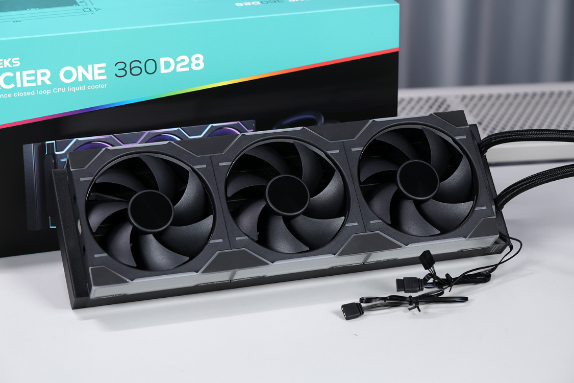 水冷预装3把D28-120 D-RGB积木散热风扇,风扇之间采用触点链接,并通过一根转接线分出1根5v3Pin ARGB灯控接口和1根4Pin PWM风扇供电接口。风扇采用正面ARGB灯带+侧面ARGB无限镜的灯效结构设计。扇叶部分无光,中间是金属材质的CD纹风扇轴心。此外,还配备了硅胶材质的隐藏式螺丝盖。