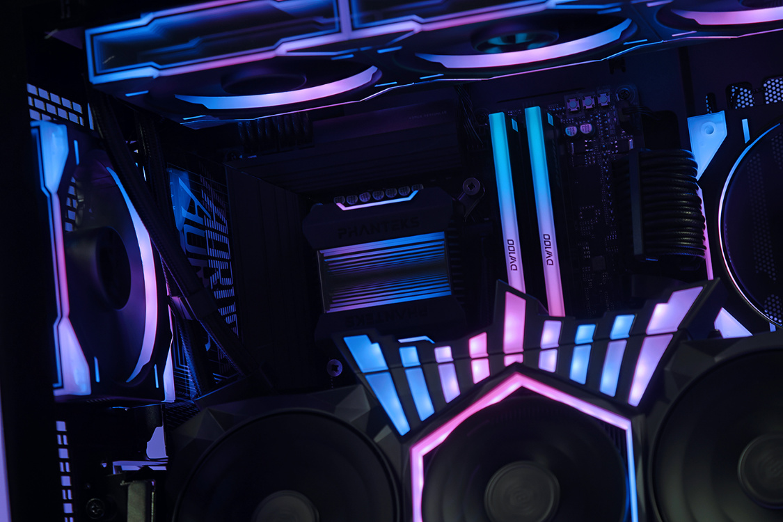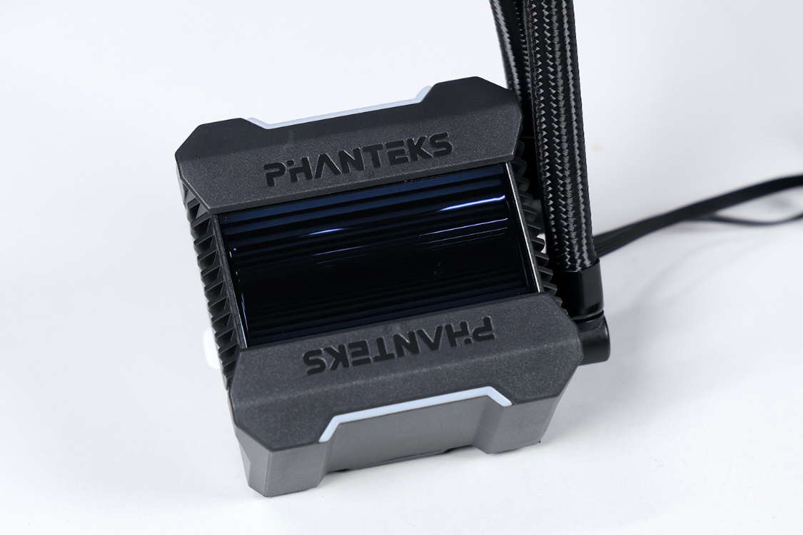 水冷采用方形冷头外形,顶盖配备了一块ARGB无限镜+2条ARGB灯带的灯效结构。冷头内部集成的高扬程低噪水泵,则最高可提供3000±10%RPM的转速,搭配上纯铜底座上的微水道鳍片,可以快速将CPU的热量送入冷排,保证CPU长时高效稳定的运行。