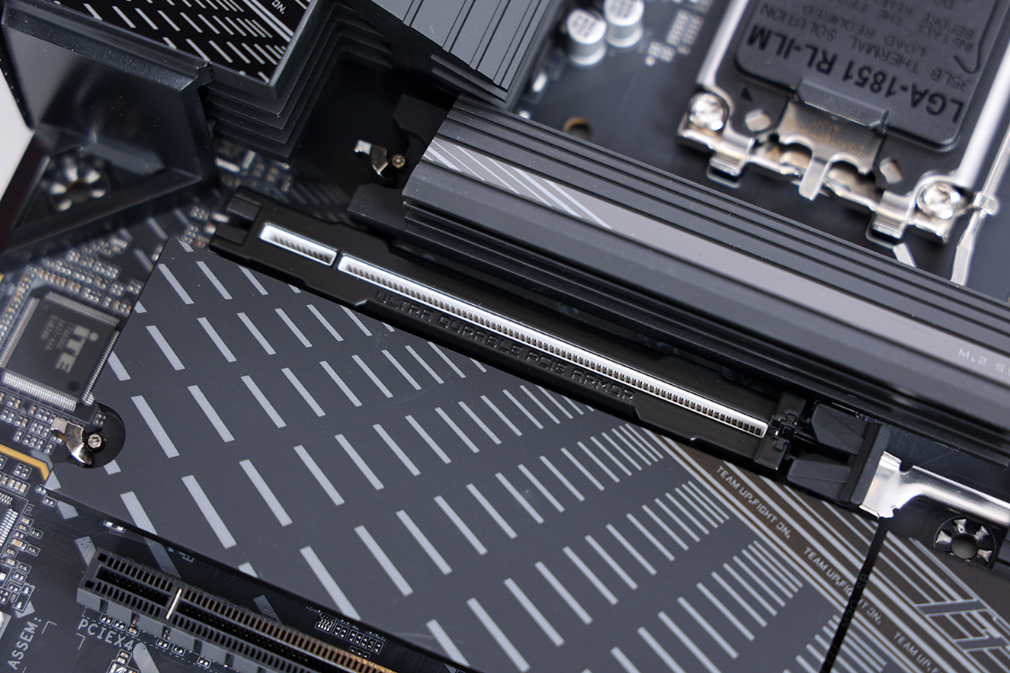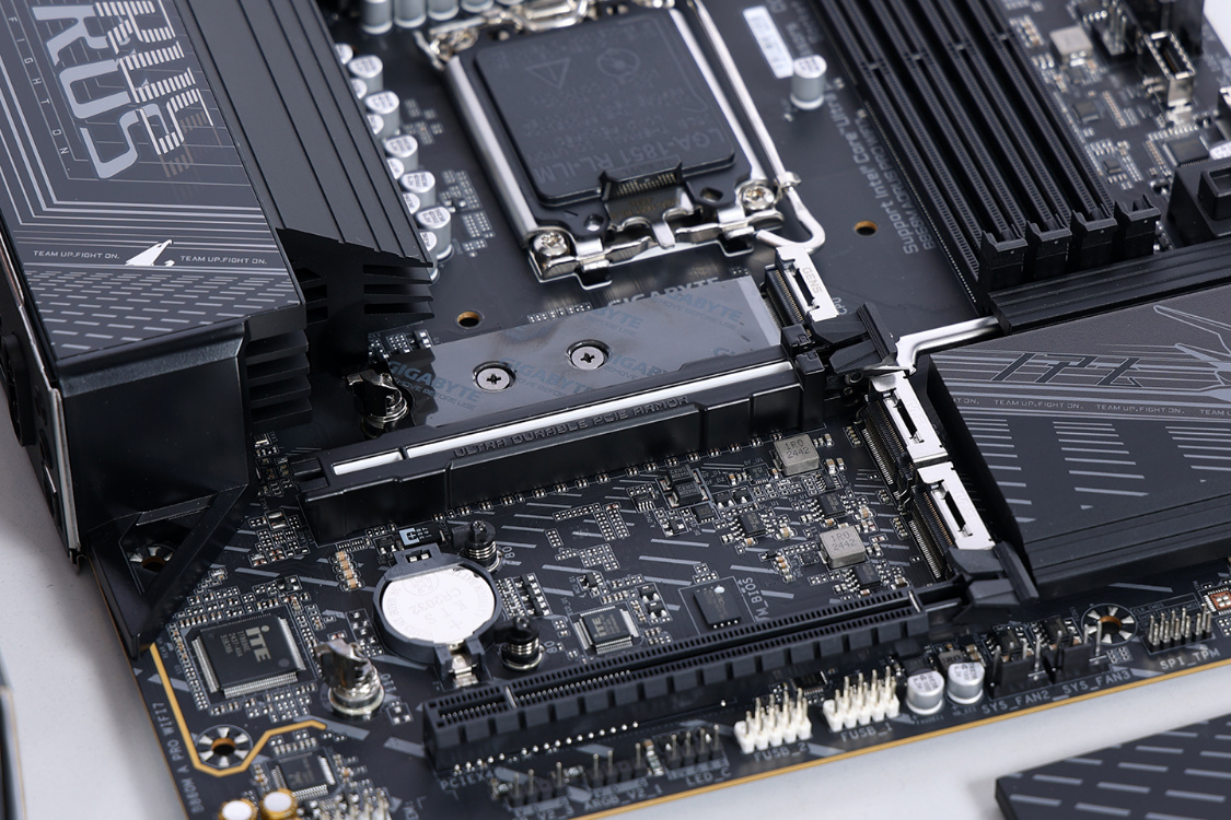 2个x16规格的全长PCIe插槽,近CPU的PCIe插槽,支持PCIe 5.0 x16的传输速率,并采用了技嘉独创的显卡快拆卡扣设计,便于玩家在狭窄的机箱里快速拆出显卡。插槽有金属马甲进行加固,搭配上主板背面对应位置的辅助钢板,可以提高PCIe插槽的结构强度。另一条PCIe插槽则最高支持PCIe 4.0 x4的传输速率。