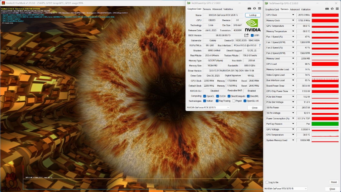 FurMark烤机测试,烤机10 Min后,显卡温度为60°左右,显卡功耗300W左右;