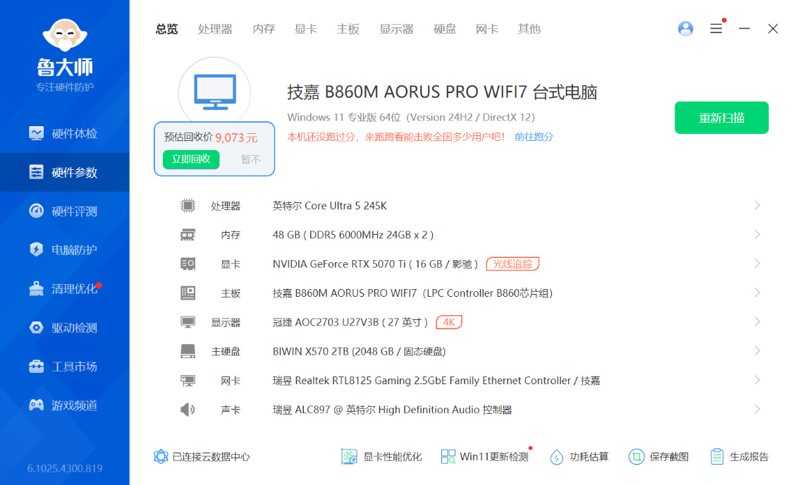 鲁大师整机测试得分253.2W分,回收价精准五折;