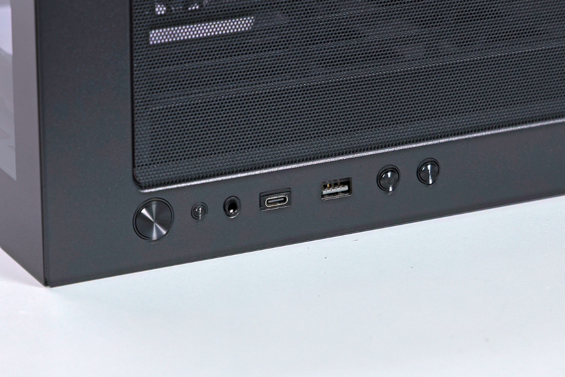 机箱I/O面板位于机箱顶部边缘处,提供:1个带有CD纹路装饰的开机电源按钮、1个重启按钮、1个3.5mm音频输入输出接口、1个USB 3.2 Gen2x2 Type-C 20Gbps数据接口、1个USB 3.0接口、1个灯光模式选择按钮、1个灯光颜色选择按钮。