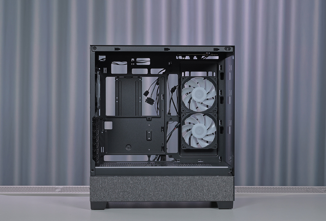 追风者XT523 MATRIX像素版黑色海景房机箱,产品尺寸:440*230*500mm。纯黑配色,无A柱、双玻璃面板结构,可视角度可达270°。机箱表面设计了大量散热网孔(内附磁吸防尘网),还预装了3把ARGB散热风扇。