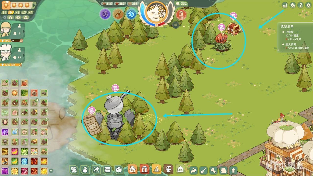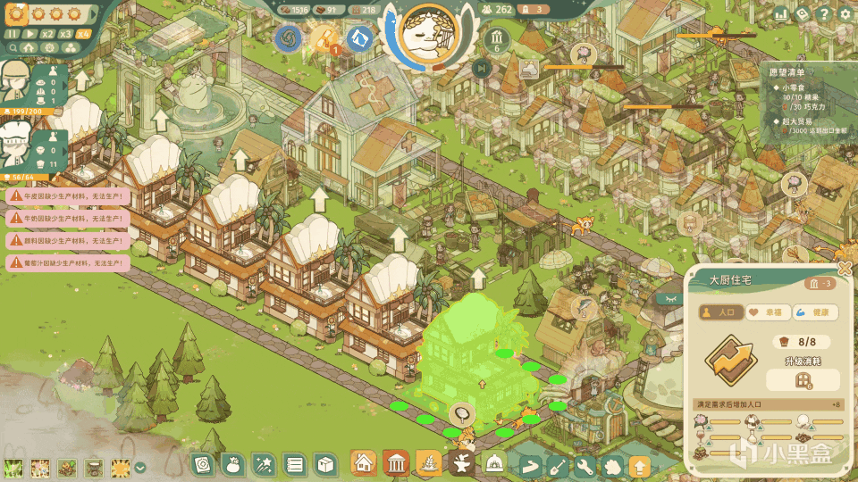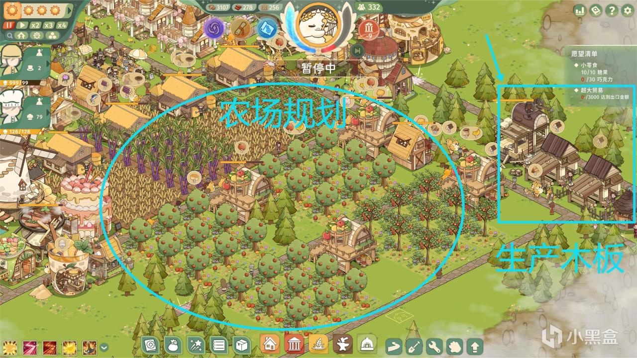 注:實際上除開木板是剛需,磚塊和窗戶可以到遊戲中期不是很夠用的時候,再轉移人口去進行生產!開局主要是先滿足喫,以及開圖,都需要農作物以及水果,並且團團前兩波的食物需求並不會要求多高星級,所以開局的發展側重肯定是喫和發展人口!