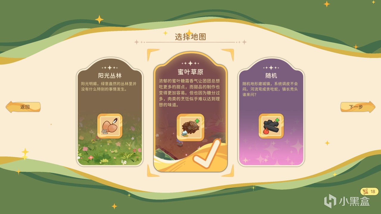同時,在選擇難度以後,有5種地圖可供大家遊玩,每一種地圖會有一些特殊的BUFF效果,像蜜葉草原,甜品的產出會有一定的加成,而反之肉類食品的產出則會降低效率!
