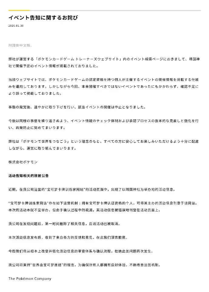 今日,宝可梦官方发文称已对神社事件进行处理!并强化审核杜绝相关事件再次发生!