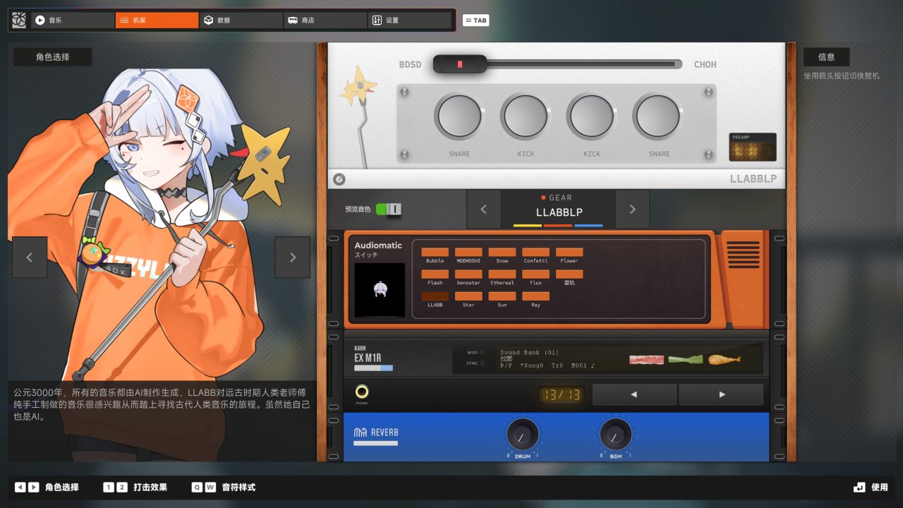 玩家不僅有四種機娘選擇,每個都有獨特的機娘形象與面板UI,在鼓點聲音上也有不同,讓你每次闖關都能收穫不一樣的體驗,在相同的曲子里加入不同鼓點,這何嘗不是個「創作音樂」的過程呢?