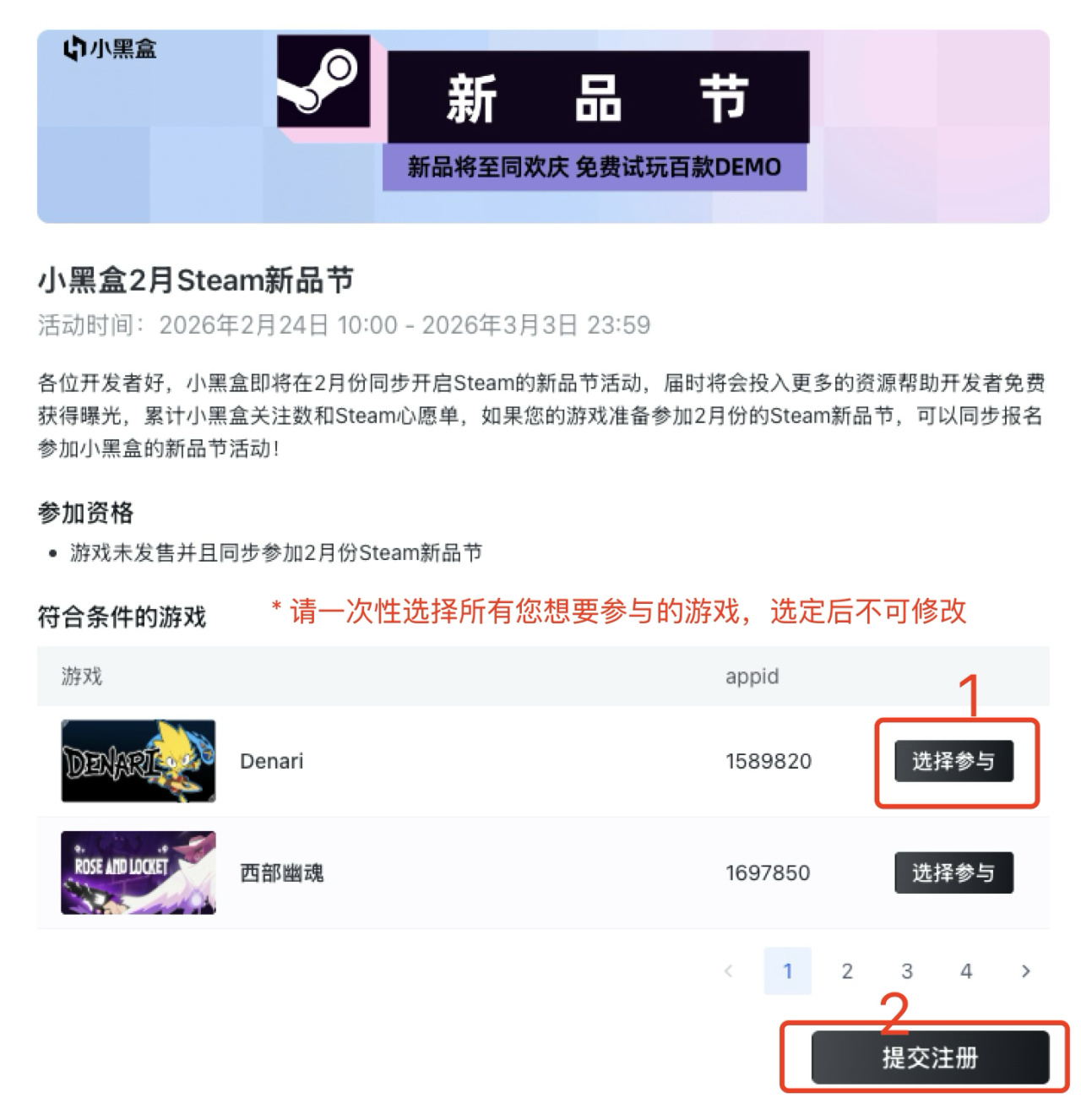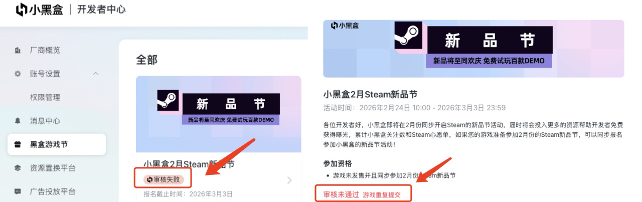 • 報名對象:同步參加2月Steam 新品節,且已在小黑盒開發者服務平臺完成認領的遊戲。