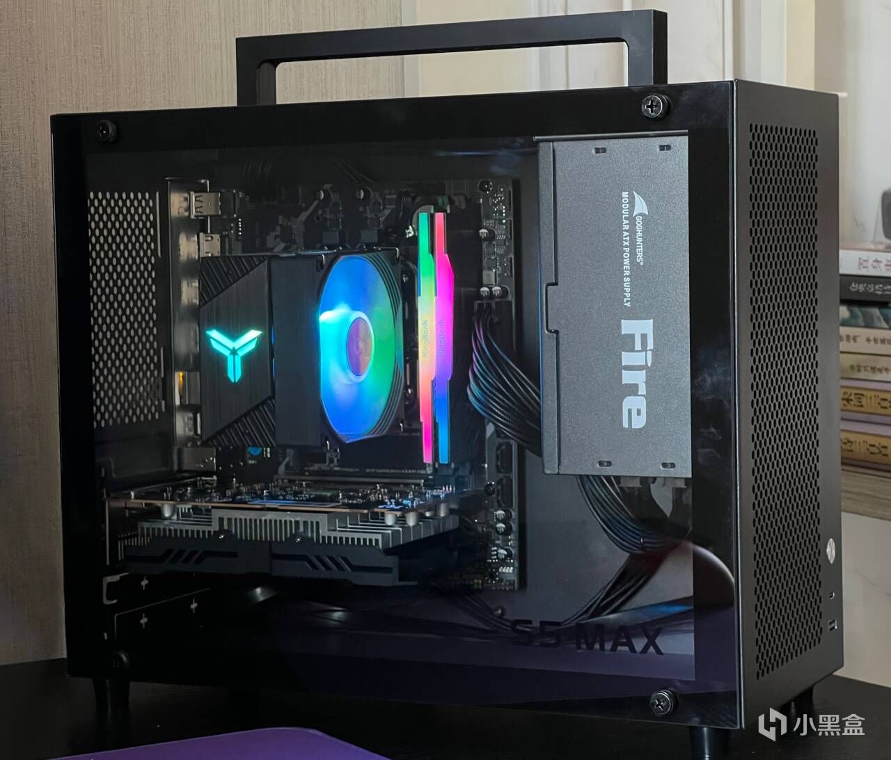不得不说,鱼巢S5 Max机箱是真小啊,整体比矿泉水瓶高不了多少,我这才100x60cm大小的桌面,放一台24寸显示器+一台主机+全套外设都绰绰有余,桌面紧张党狂喜。