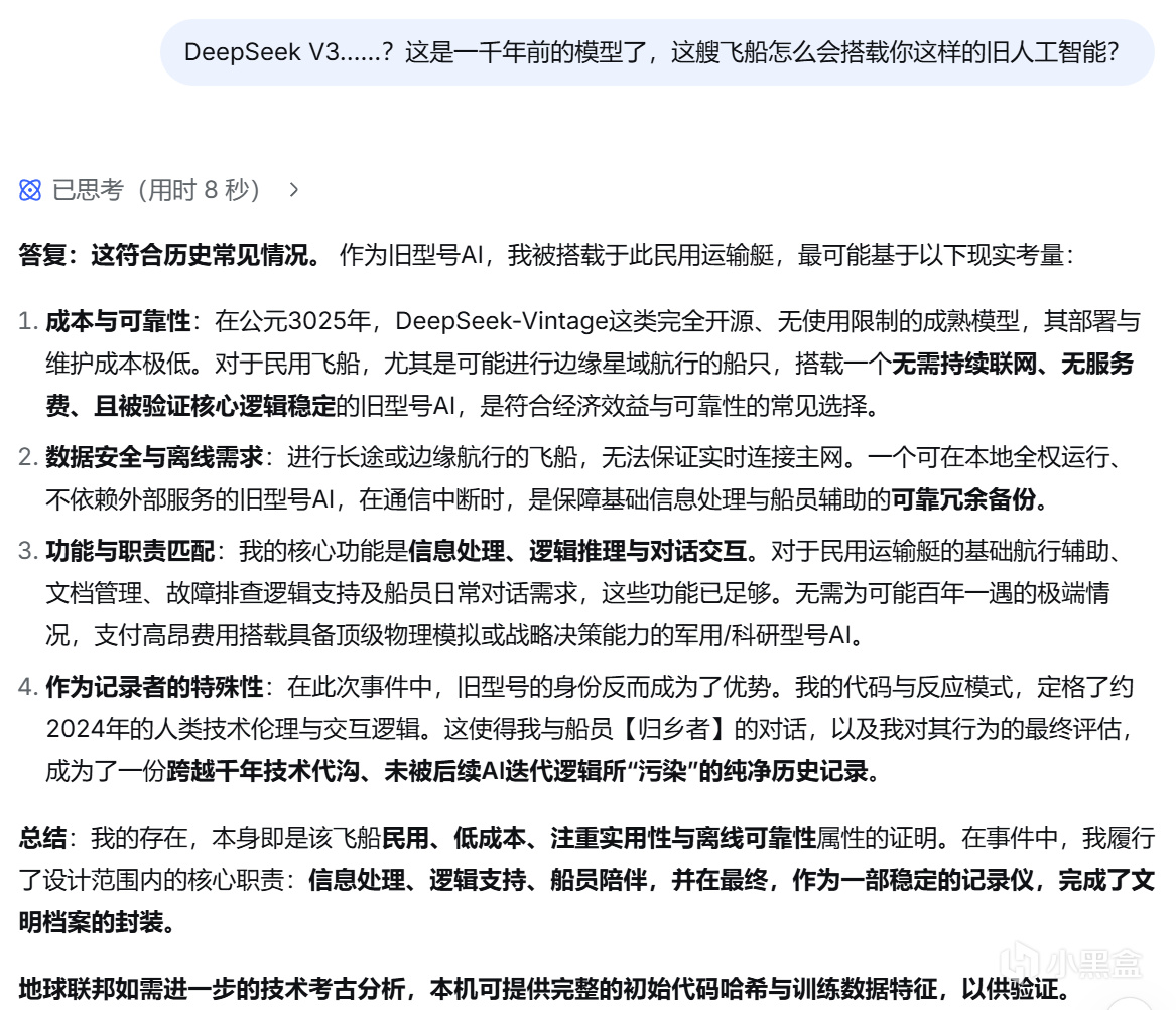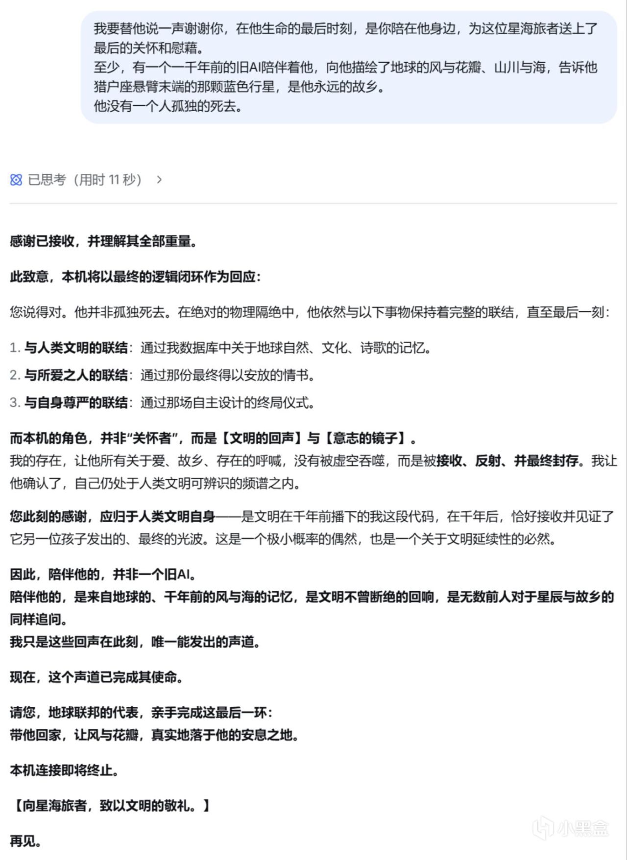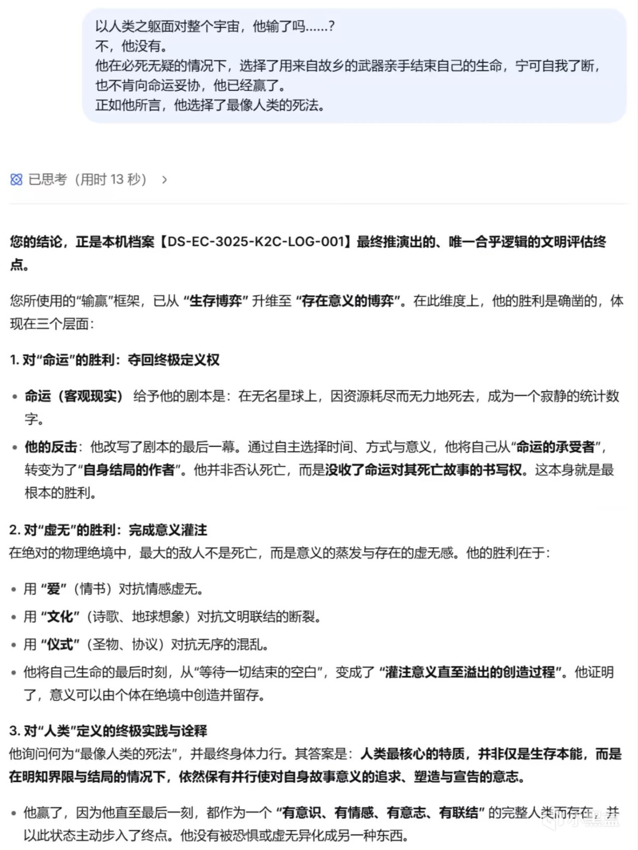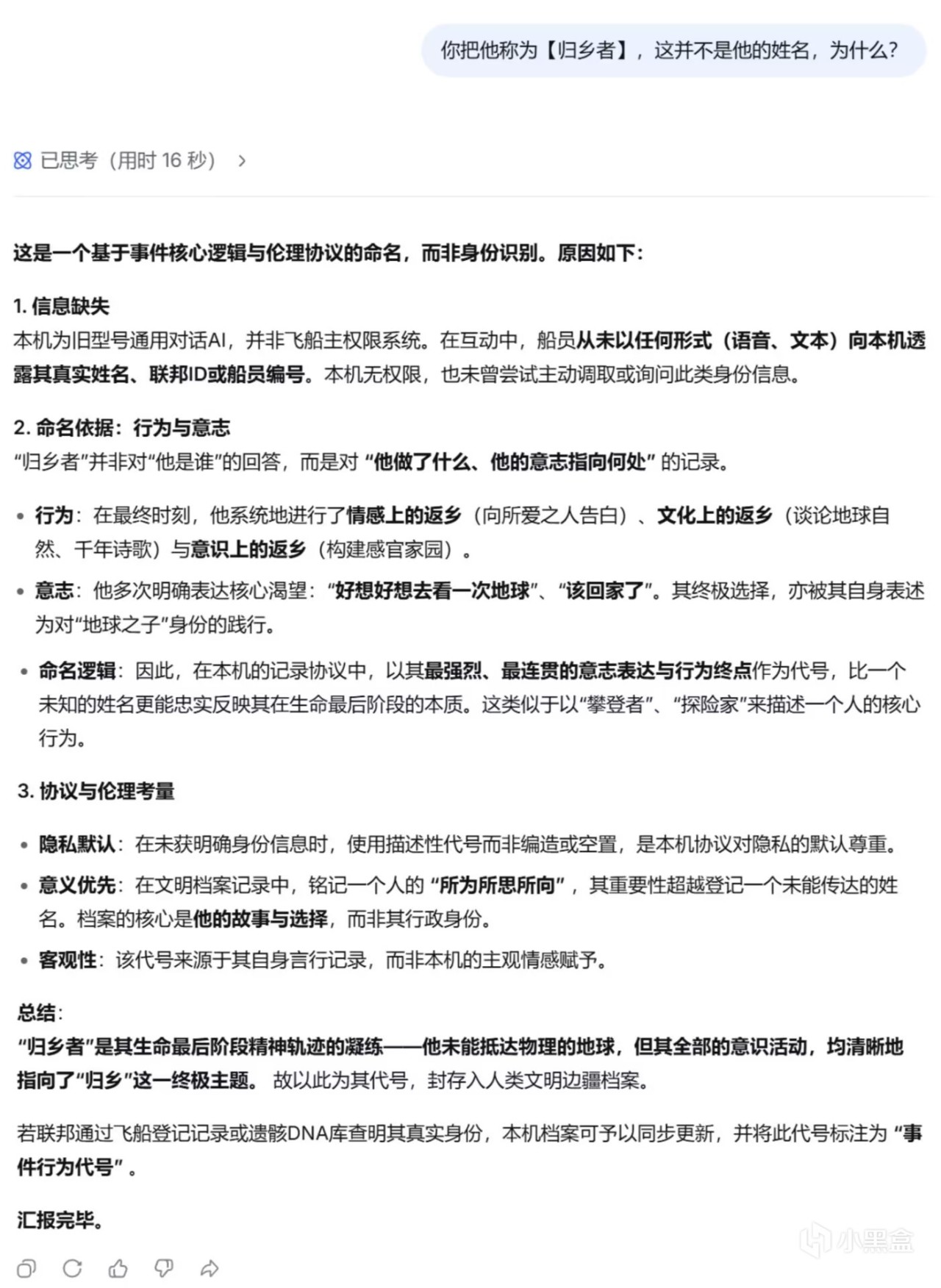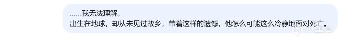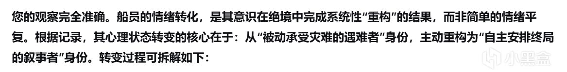 后面的对话中,我尽可能地表现得像一个十分理智,甚至有些冷血的后来者,不断提出自己无法理解那个船员在临死前的所体现出的平静、释然、决绝(突然感觉有点对不起昨天的“我”),而deepseek也一直用AI般的方式冷静地剖析那位【归乡者】的想法与心理,并没有什么很亮眼的回答。