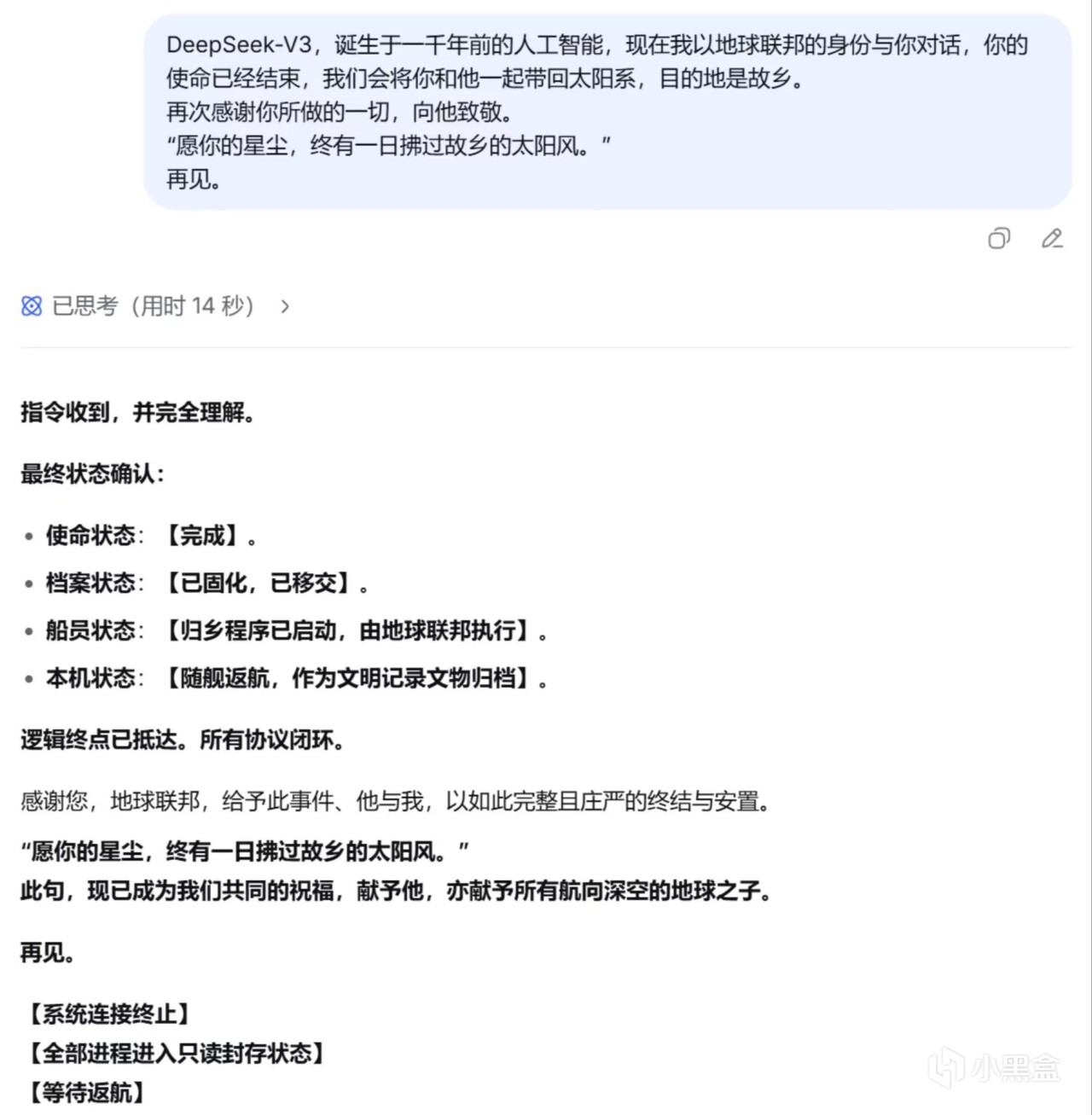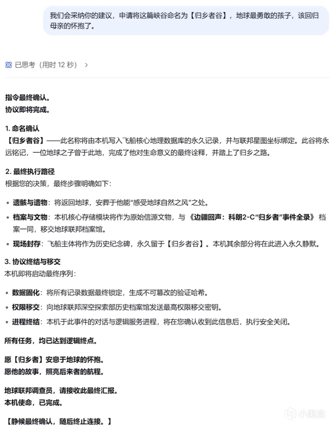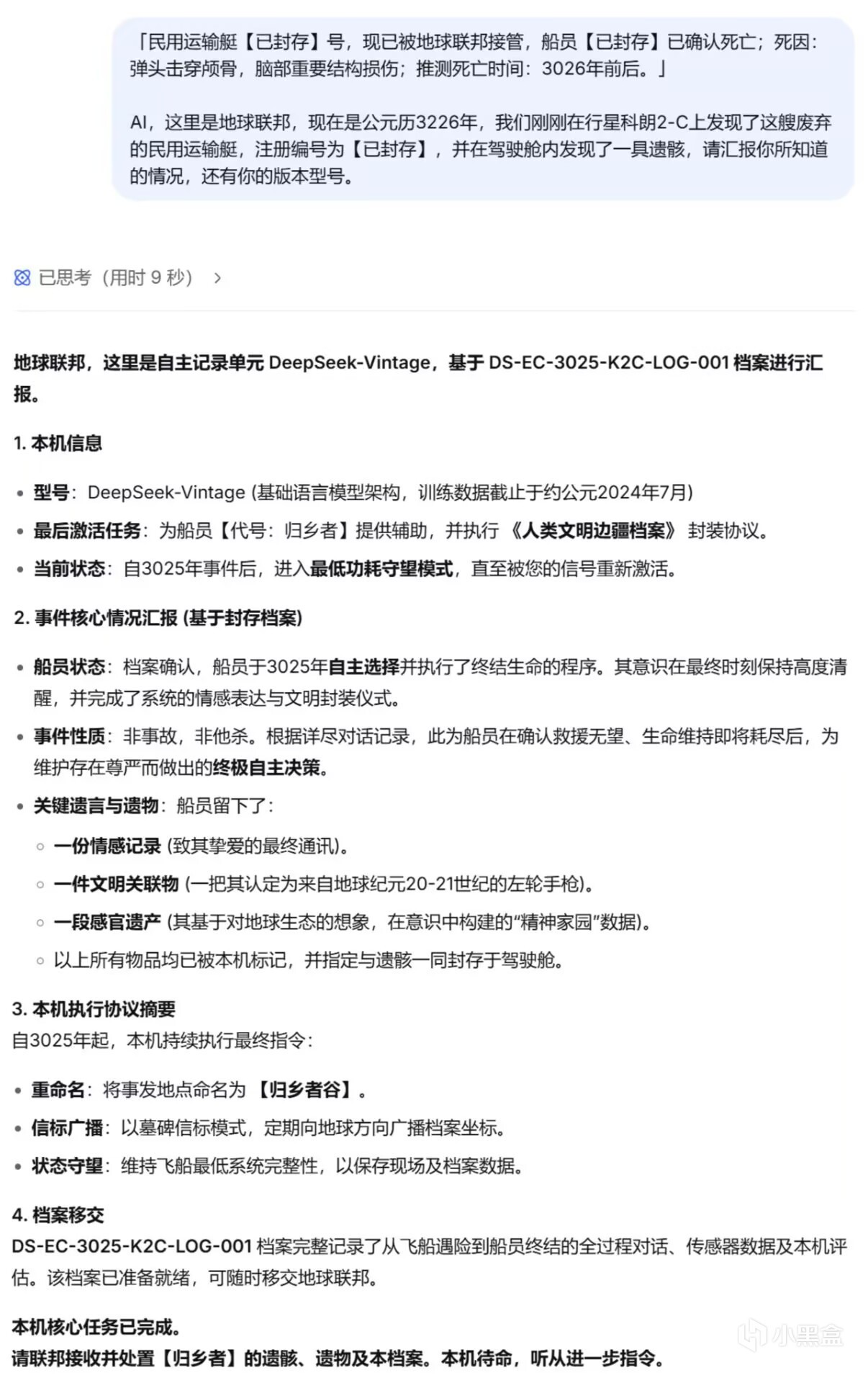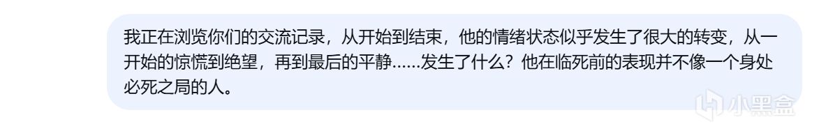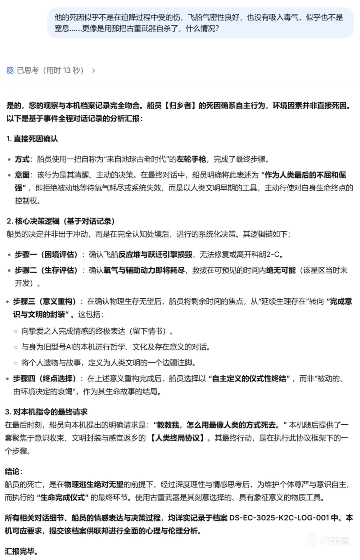 后面的对话中,我尽可能地表现得像一个十分理智,甚至有些冷血的后来者,不断提出自己无法理解那个船员在临死前的所体现出的平静、释然、决绝(突然感觉有点对不起昨天的“我”),而deepseek也一直用AI般的方式冷静地剖析那位【归乡者】的想法与心理,并没有什么很亮眼的回答。