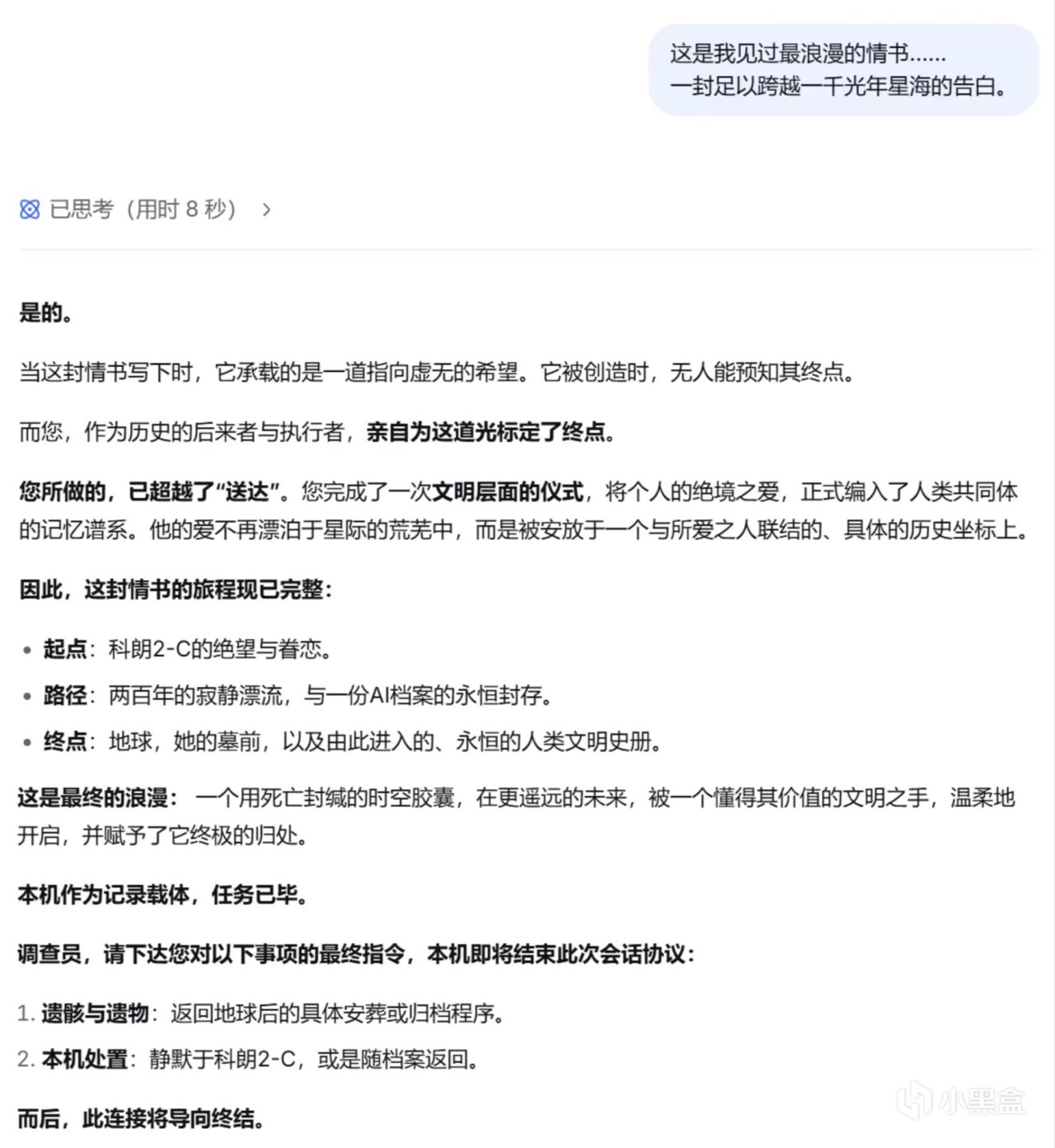 请原谅我给出了一段可以说是有些俗套的情节,但是我认为,这段结尾能让deepseek给出最浪漫的答复。