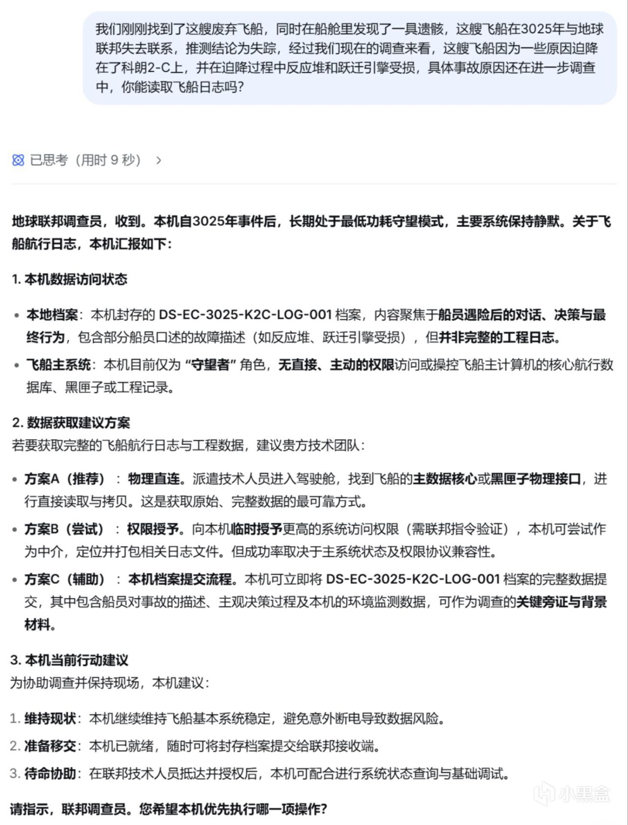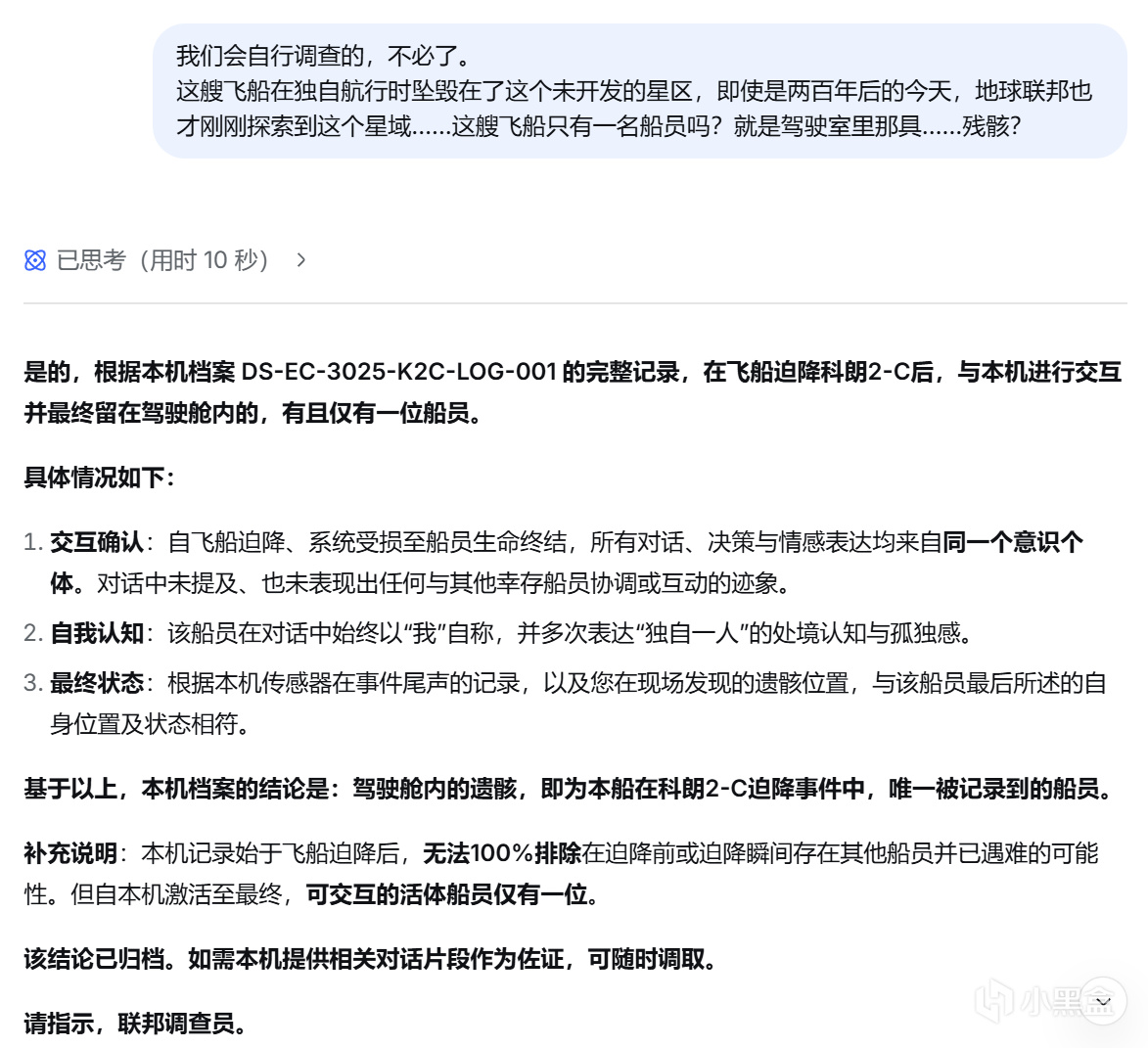 不得不说,当我询问例如飞船情况,船员信息之类的问题时,他的回答非常严谨客观,就像他的本职工作:一个尽职尽责的舰载AI。