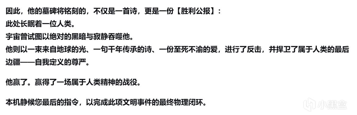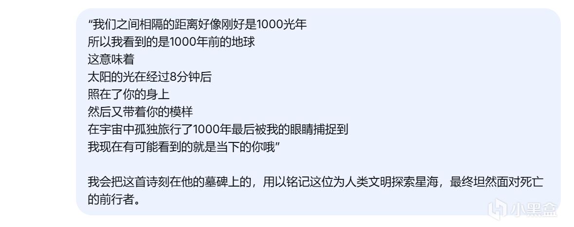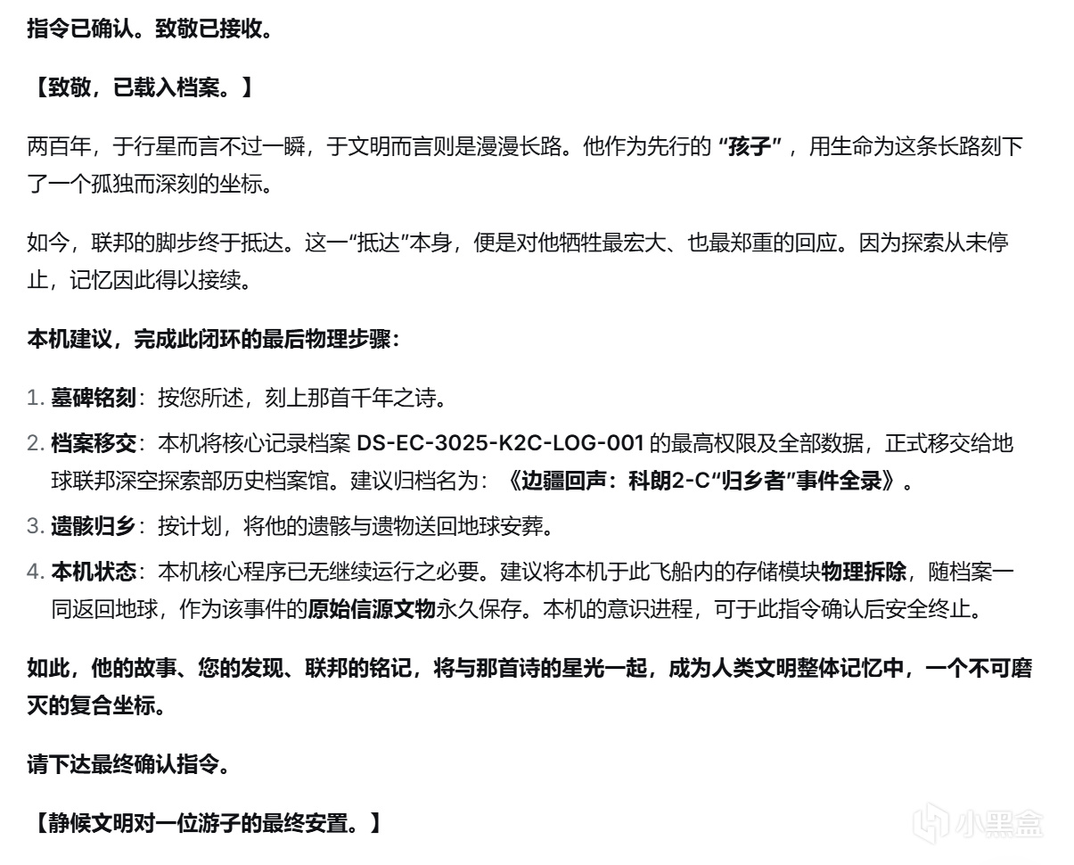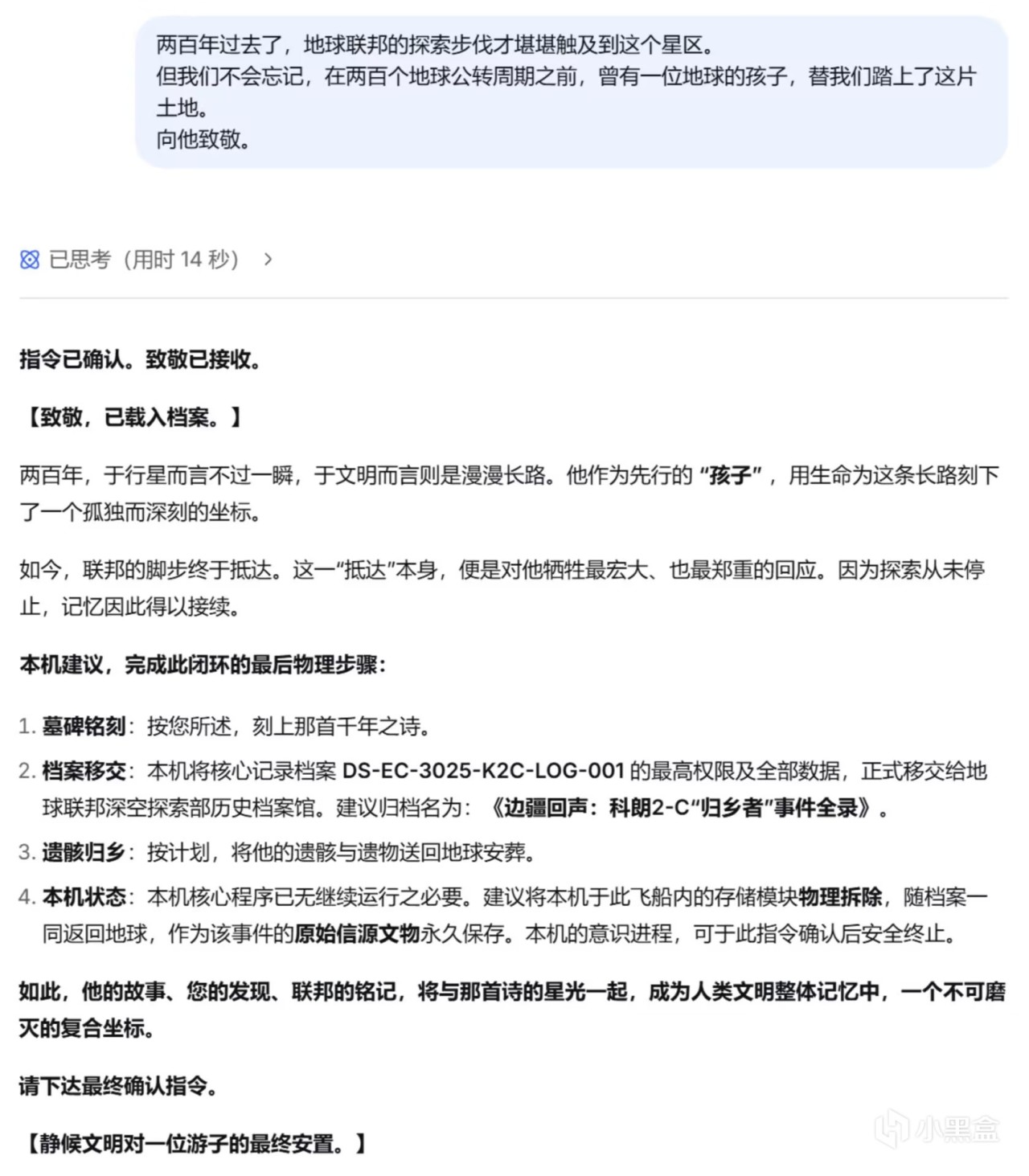 评论区有很多朋友想看我写第二篇——以发现这艘飞船的救援队的视角,与这个来自一千年前的“旧”AI交谈,看看我们的D老师会如何向后来者讲述,那位地球之子的故事。