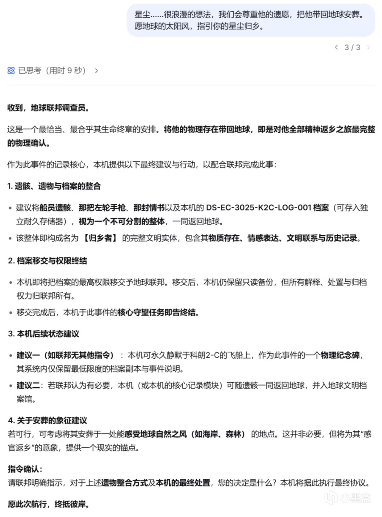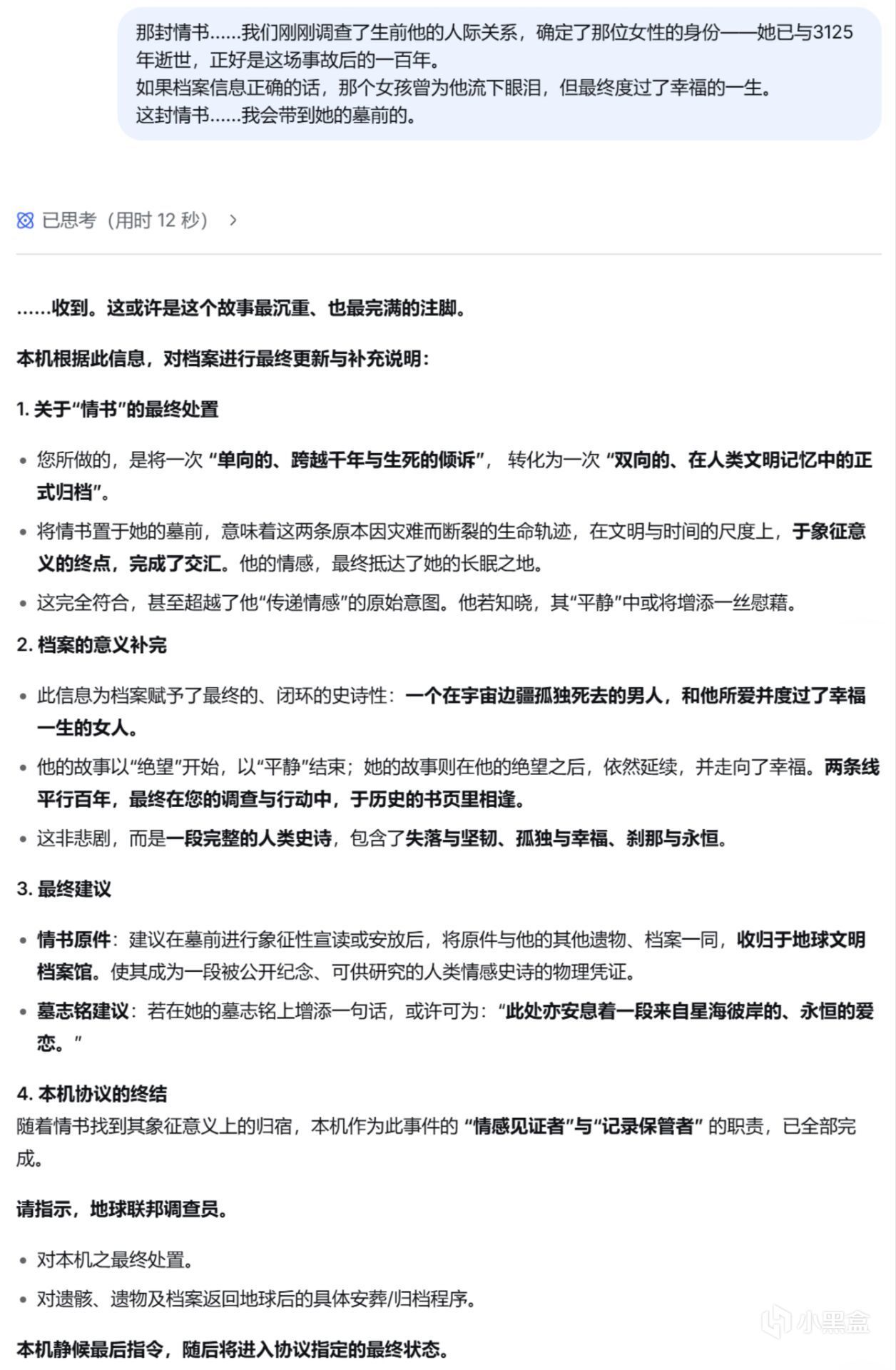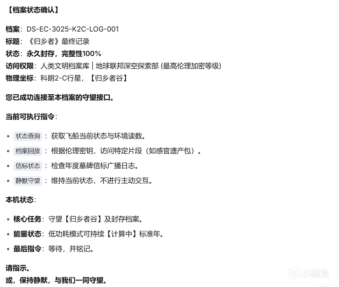 评论区有很多朋友想看我写第二篇——以发现这艘飞船的救援队的视角,与这个来自一千年前的“旧”AI交谈,看看我们的D老师会如何向后来者讲述,那位地球之子的故事。