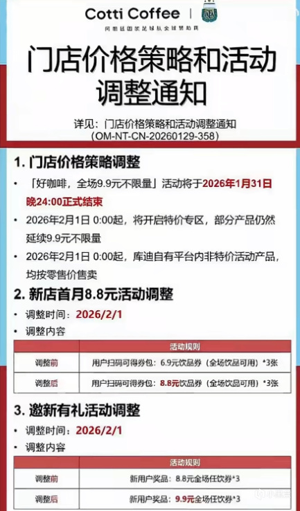 1 月 30 号就有网友晒出通知,说 “全场 9.9 元不限量” 活动 1 月 31 号午夜正式停摆,当天库迪负责人也确认了这事。