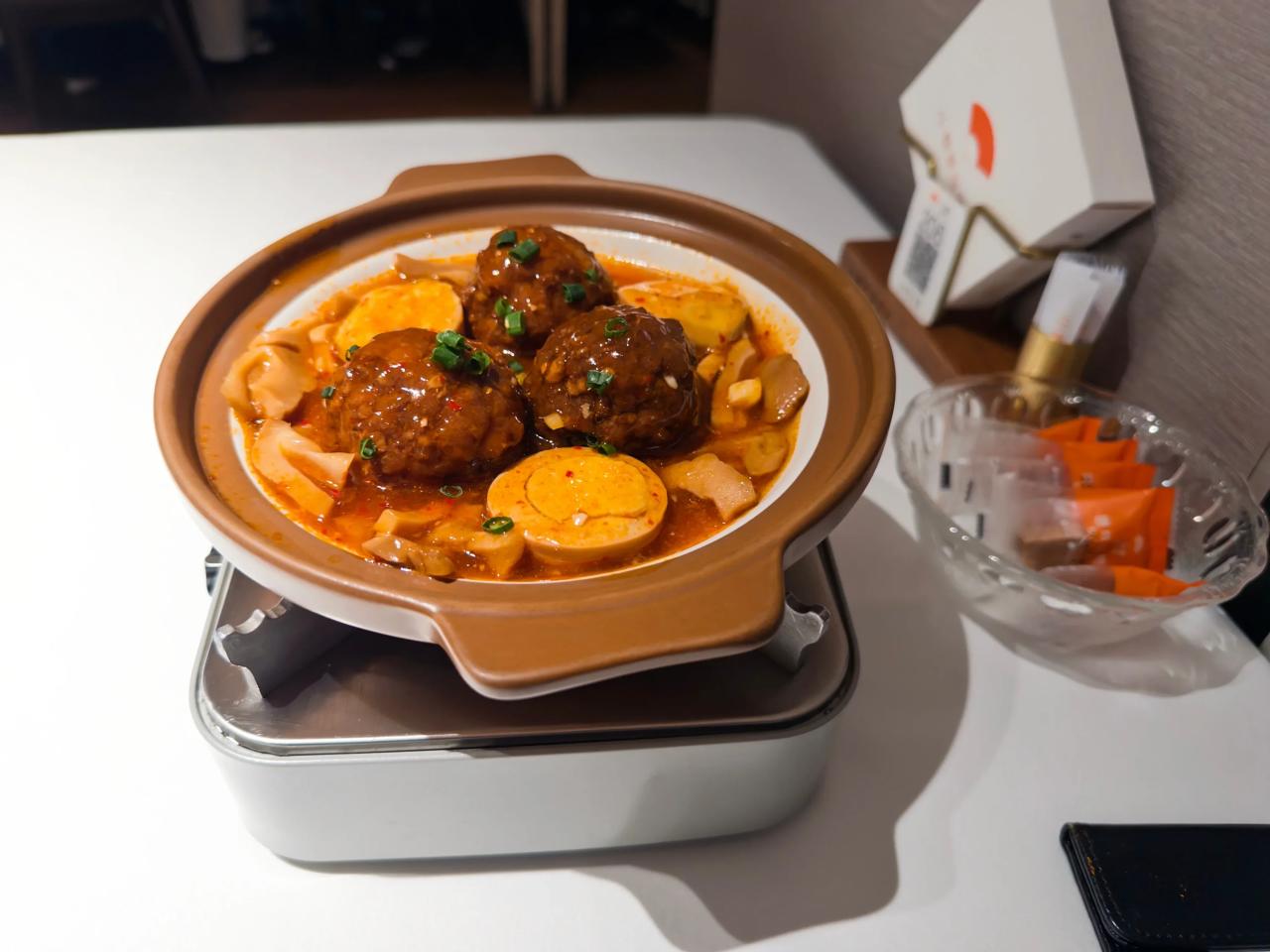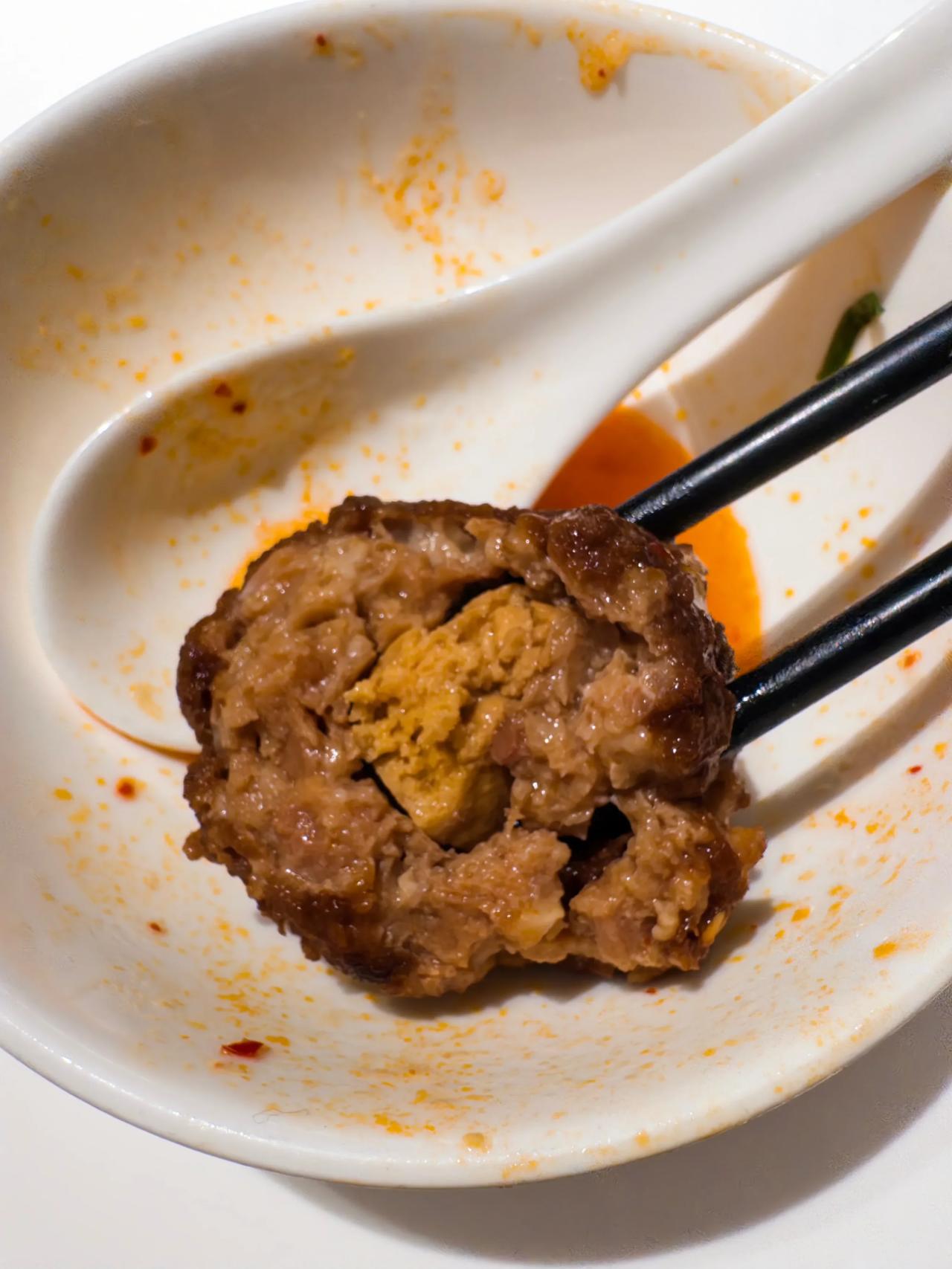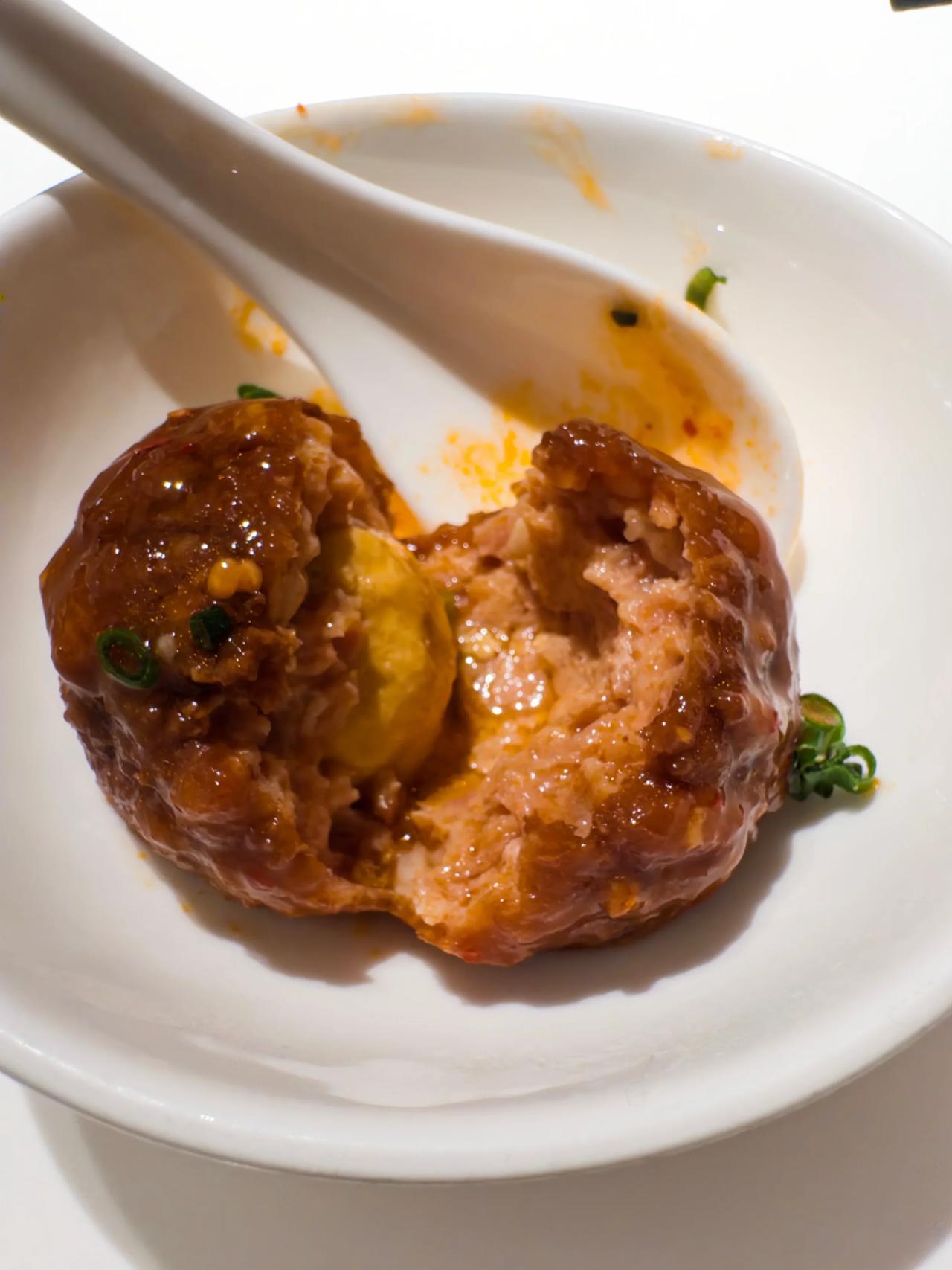狮子头,里面包了咸蛋黄,层次感丰富,酱汁是酸甜辣口,浇在卤蛋上吃起来明显,但是吃狮子头的时候还是以肉的味道为主,鲜咸口,肉嫩多汁谁吃谁知道