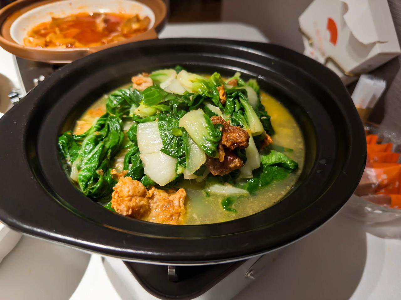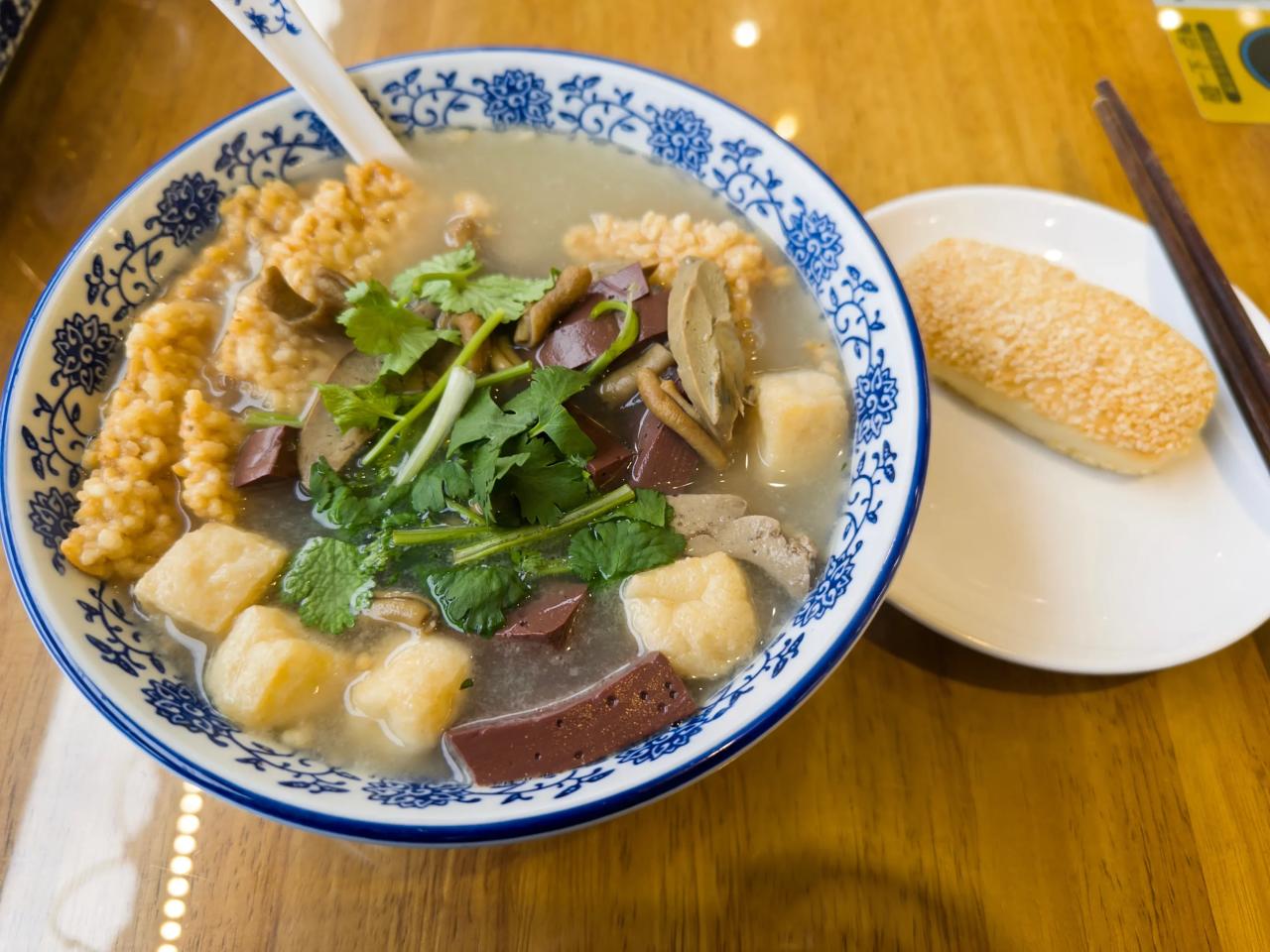 早餐吃了鸭血锅巴和一个酥饼,中规中矩,锅巴配鸭血粉丝很香