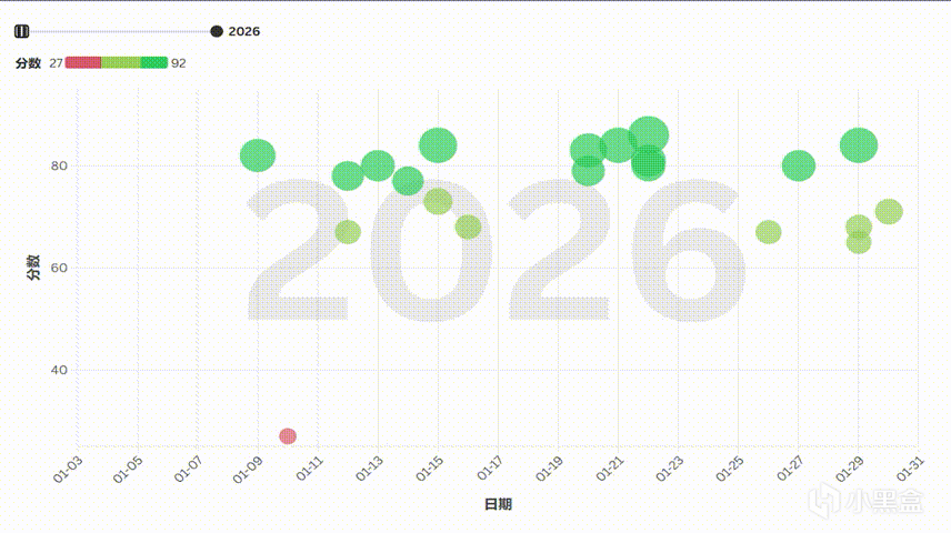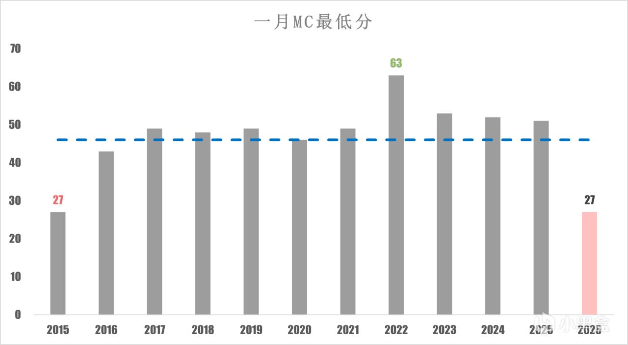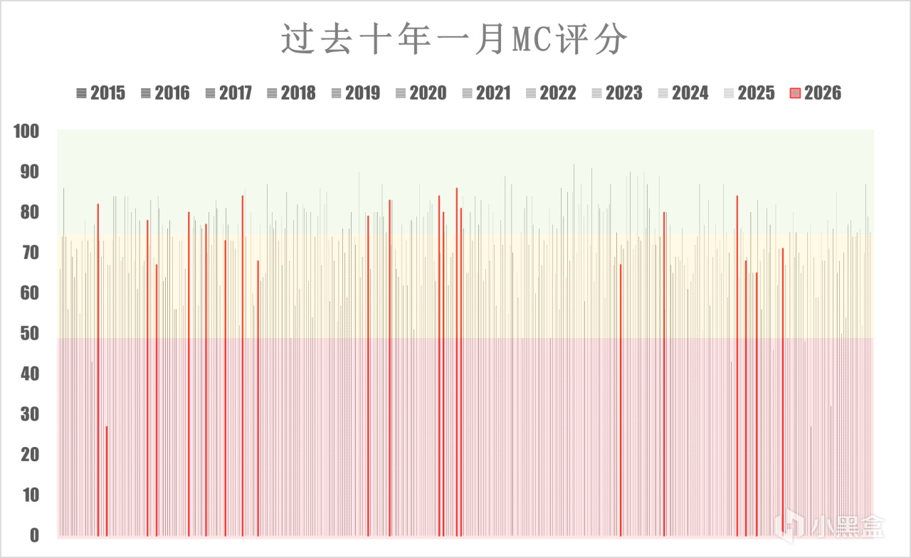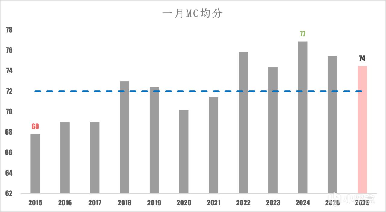 即使有“歷史級”27分遊戲拖後腿,但是開年分數不像2015年一樣,成爲了均分倒數第一,2026年的均分甚至有74分,大幅超出平均分數線。