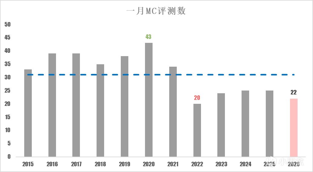 2026 年 1 月,僅有22部遊戲送評,延續近年低產出態勢,評測數量處於歷史均值以下,是近十年來的第二低,雖然沒有逆轉2021對媒體和遊戲行業的衝擊,但仍維持在相對穩定區間。