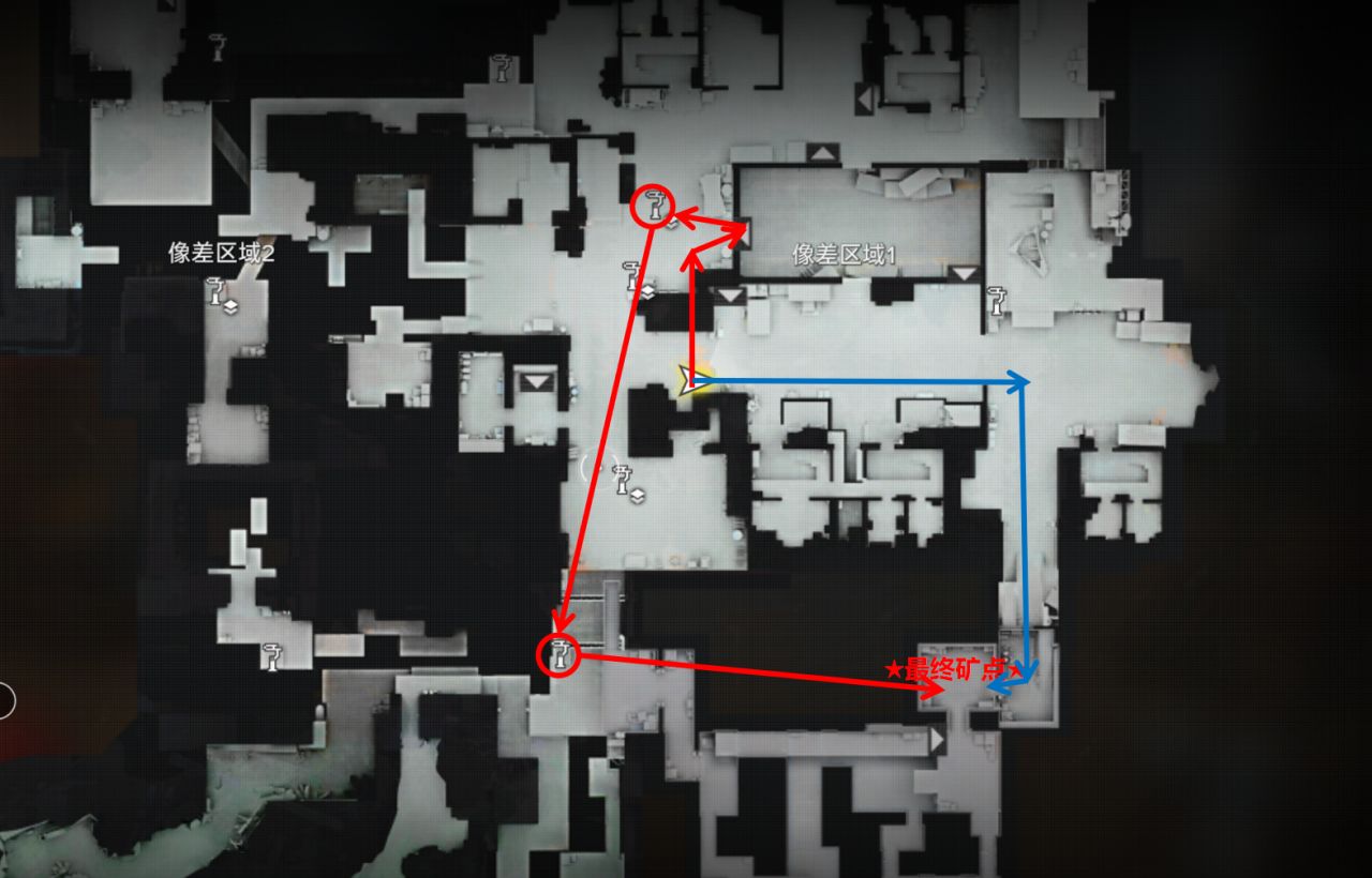 正常路线(100秒):篝火位置往北走 往下跳到下层联通区 通过下层联通区的滑索直达像差区域3的最终矿点的门口
