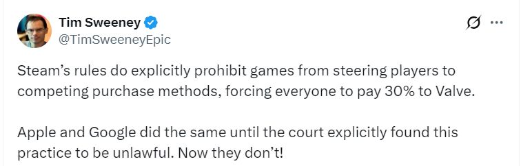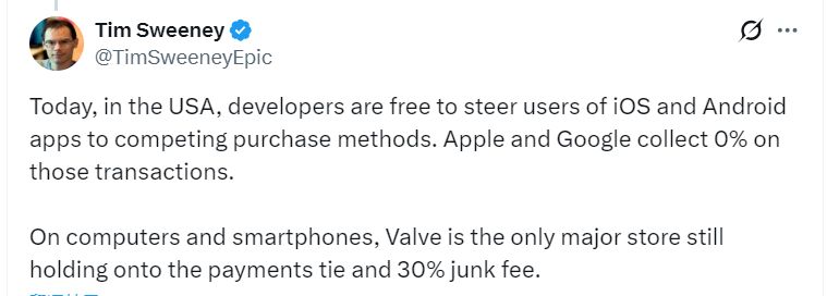 Tim Sweeney表示:“Steam确实明文禁止游戏引导玩家使用其他购买方式,强制所有人向V社支付30%的佣金。苹果和谷歌也曾采取相同做法,直到法院明确裁定此举违法。如今他们已进行整改。”