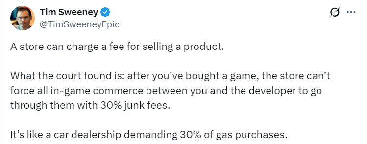 “商店当然可以为销售产品收取费用。但法院裁定的是:在你购买游戏之后,商店不能强迫你和开发者之间所有的游戏内交易都继续通过它进行,并收取30%的所谓附加费。”