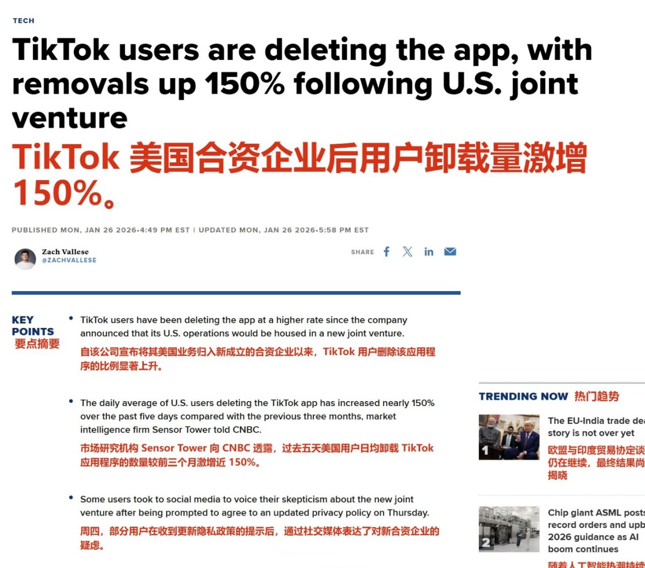 最近因爲“TikTok”高層組建新的米國合資公司來管理“TikTok”,導致外國網民失去了言論“自由”,“TikTok”卸載量激增