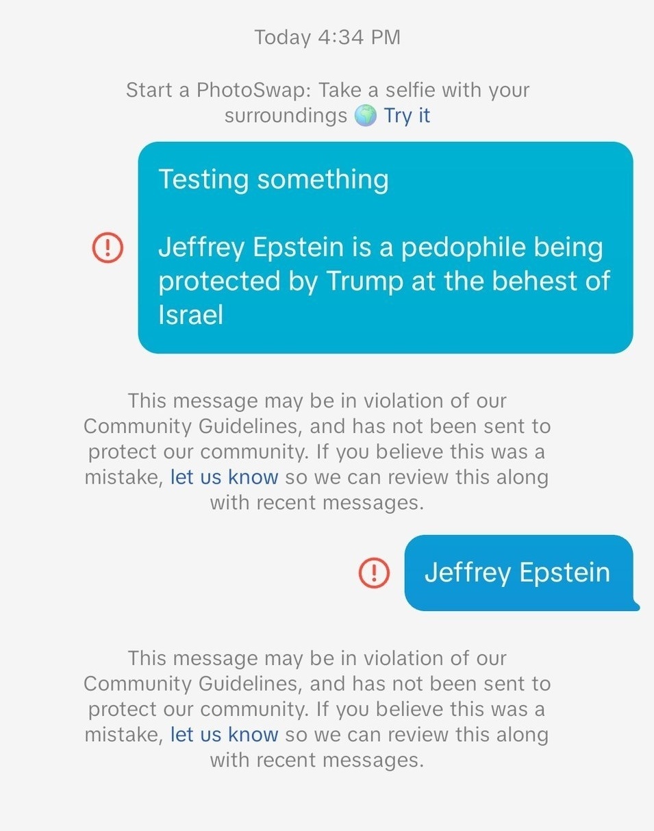目前在TikTok上發佈不了愛潑斯坦的內容,以及反對ICE的內容,甚至連私信裏說都不行。(其他投訴還包括批評“特靠譜”的內容被壓制或限流)