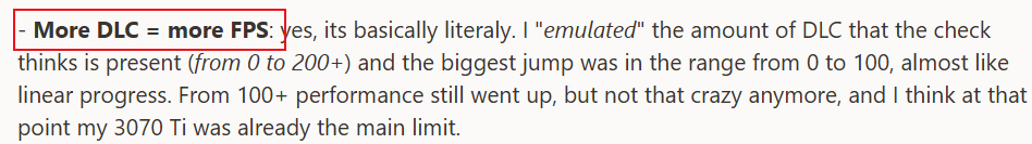 为了进一步排除是不是有其他意想不到的神秘因素干预,老哥还做了个欺骗游戏程序的小MOD,使游戏错误地认为所有的DLC都已经解锁,结果你猜怎么着?这个没有购买DLC的账号在MOD加持下,帧数也上到80了。如此一来“买的DLC越多,你的游戏就越流畅”问题算是彻底实锤了。