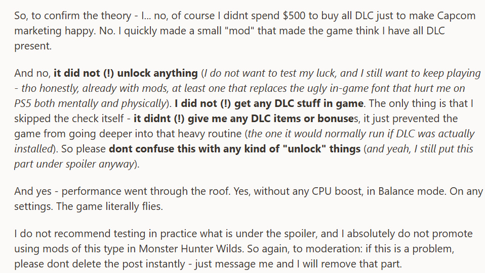 贴文中这位老哥的语气非常严谨小心,生怕他意想不到的测试过程贴文触碰论坛规则而被删。他在游玩怪猎过程中,深受游戏的性能波动所扰,在尝试了官方给出的那些无关痛痒的解决方案又完全无效后,老哥却因为一次丢档的悲剧发现,游戏在开头部分帧数就非常正常,做了各种你我都知道的改驱动、删注册表等无效调试后,又测试了几十次,发现都是游戏开头帧数很好,后面就突然拉胯的情况。结果进一步测试中,老哥似乎发现,游戏的帧数竟然和购买的DLC数量有关联!他从朋友那里借来了steam账号,用同一台电脑运行并进行监测,而两个账号唯一区别就是一个购买了全部DLC,另一个没有,结果在同一个区域,买了的账号运行帧率能上到8O,而没买的账号就只有20多帧了。