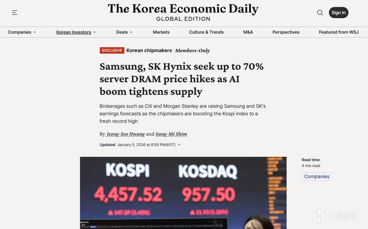 其他消息也好不到哪去,SK海力士的服務器DRAM價格計劃在第一季度上調60%到70%。