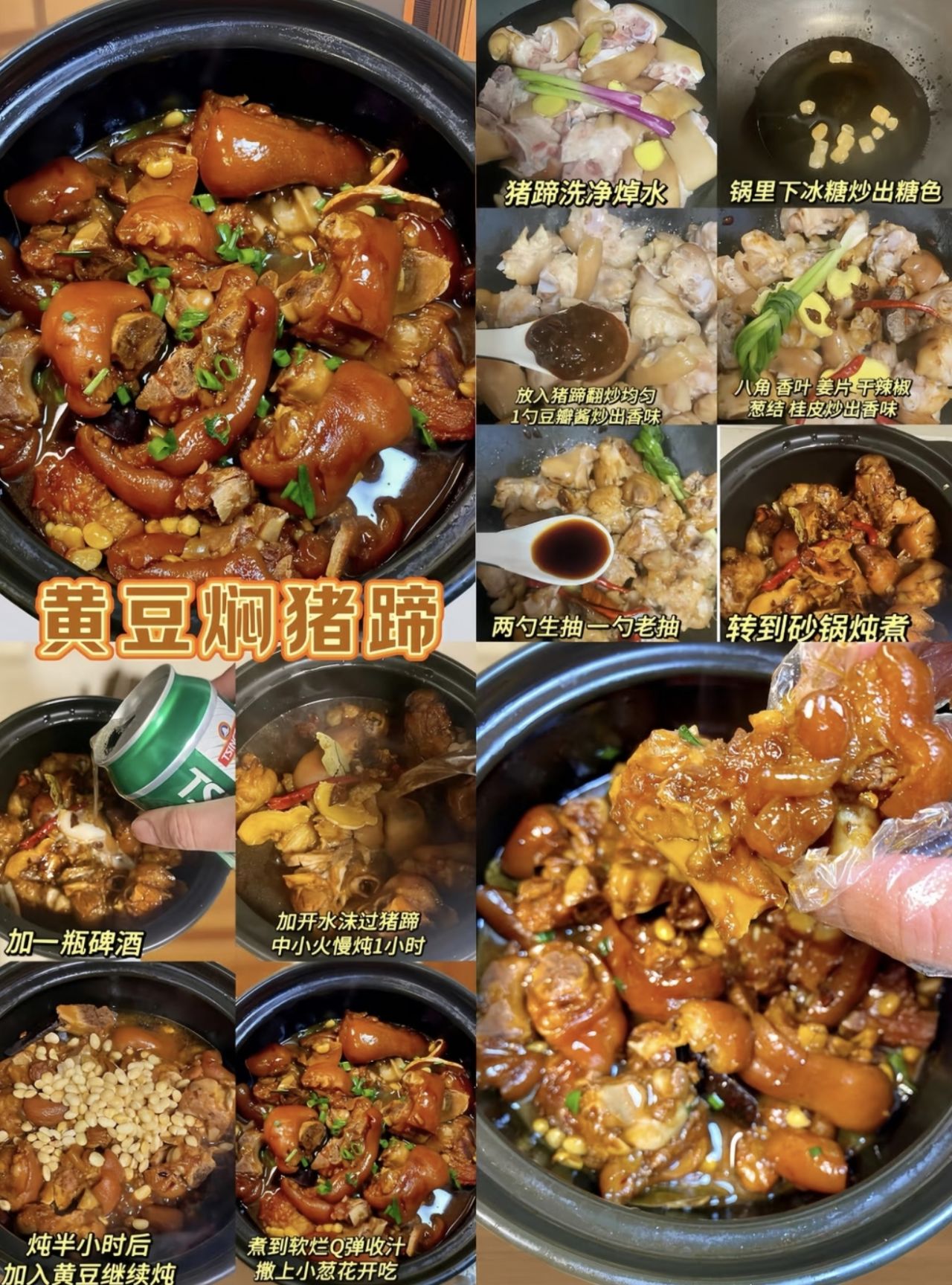 豬蹄2只、幹黃豆100g、生薑、大蔥、八角、桂皮、香葉、冰糖、生抽、老抽、料酒、鹽