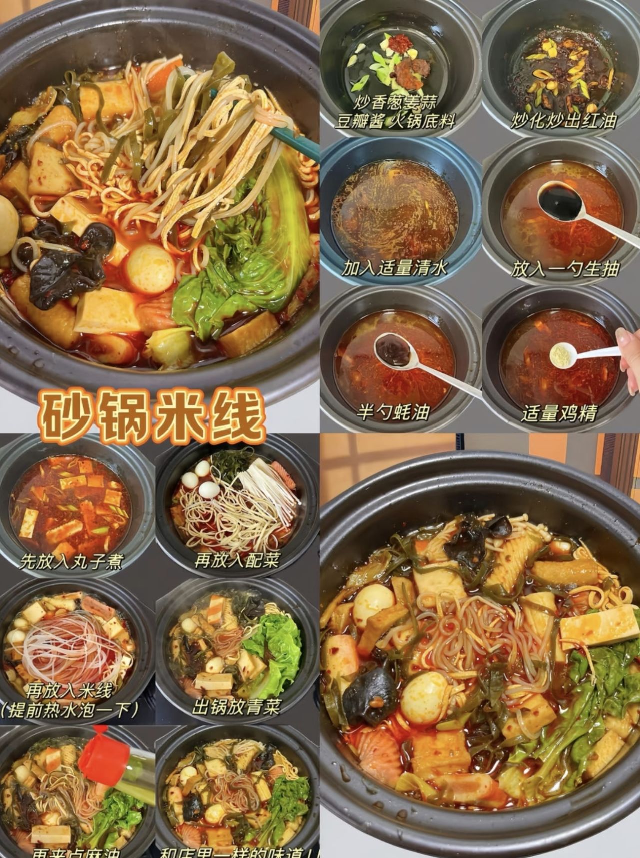 1. 幹米線提前泡軟,麪條可提前煮至半熟;砂鍋加清水或骨湯,下薑片、蒜粒煮沸,加生抽、蠔油、少許鹽、白胡椒粉調湯底。