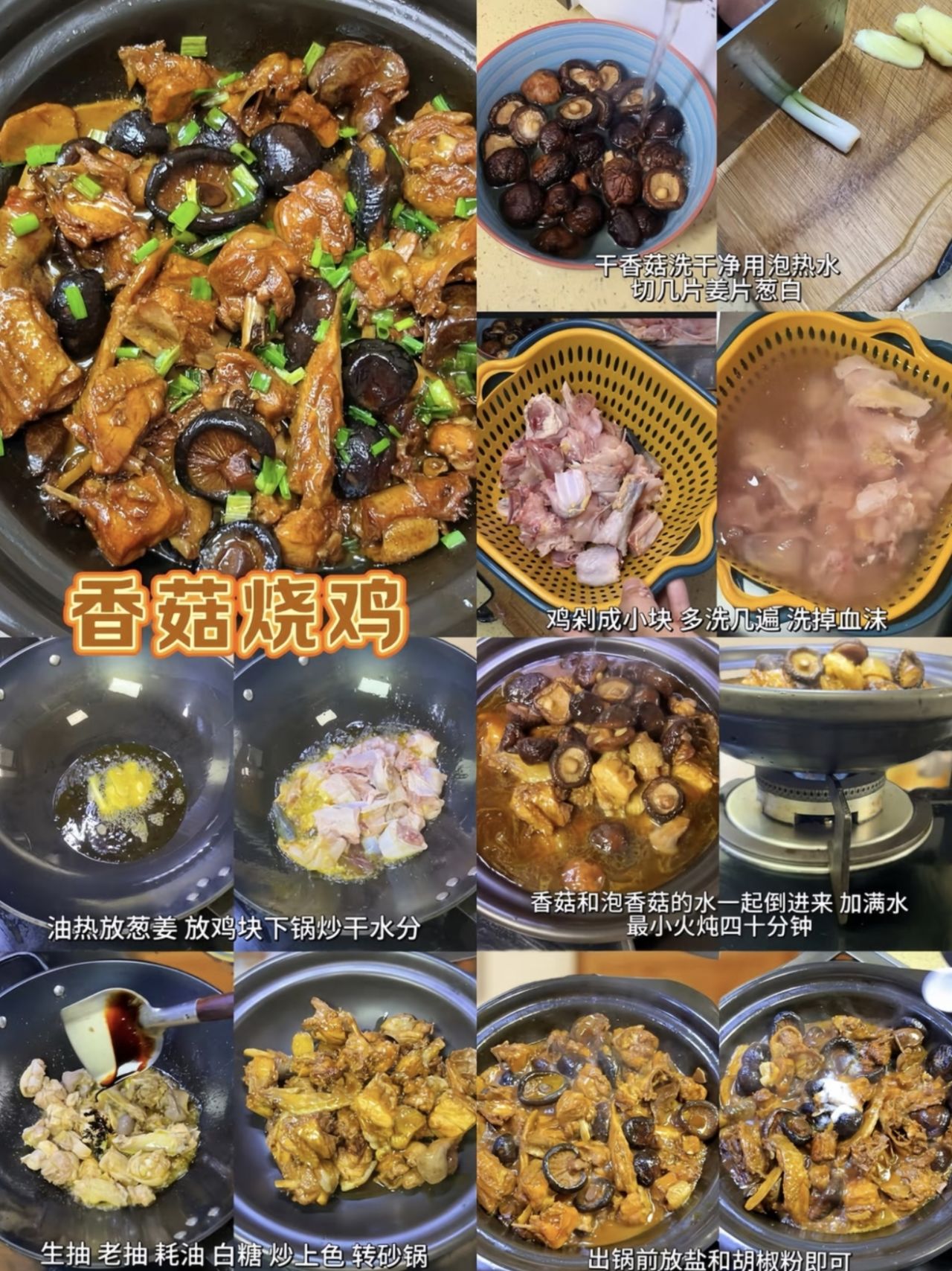 三黃雞半隻、幹香菇/鮮香菇、生薑、大蒜、八角、生抽、老抽、料酒、鹽、冰糖