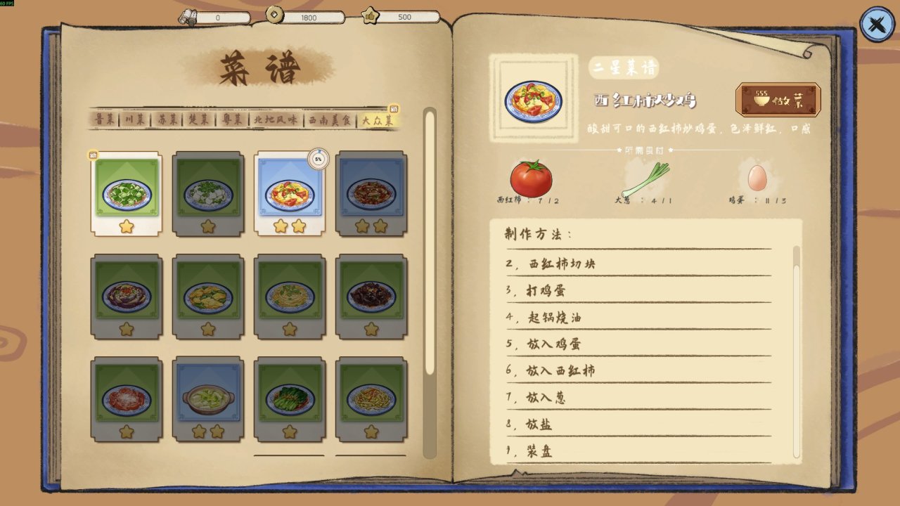 游戏的菜谱种类菜场丰富:鲁菜、川菜、粤菜、大众菜等等,应有尽有。初始我们只会西红柿炒鸡蛋和凉拌黄瓜。随着游戏的推进,我们解锁丰富多样的菜谱可供我们烹饪。在餐馆不忙的时候我们可以将做好的菜放置到回收箱里面,到了晚上会有马车将这些菜肴统一收购,结算给我们金钱。
