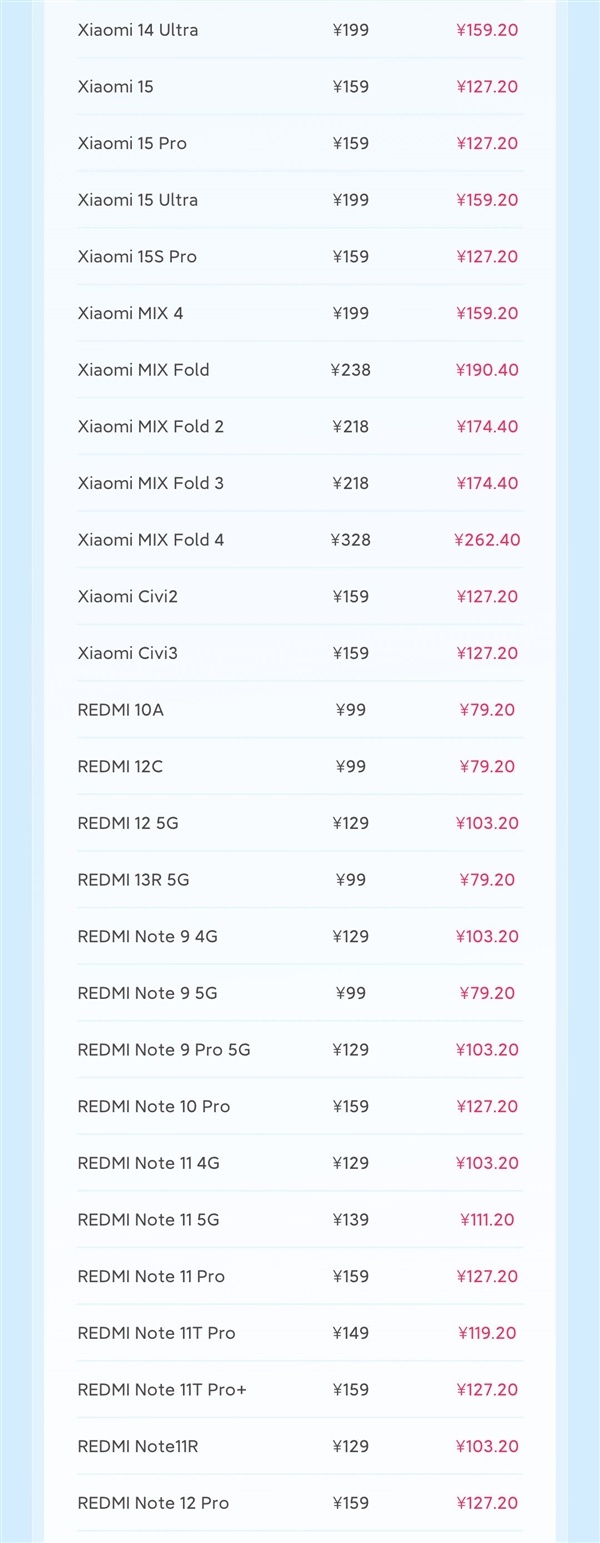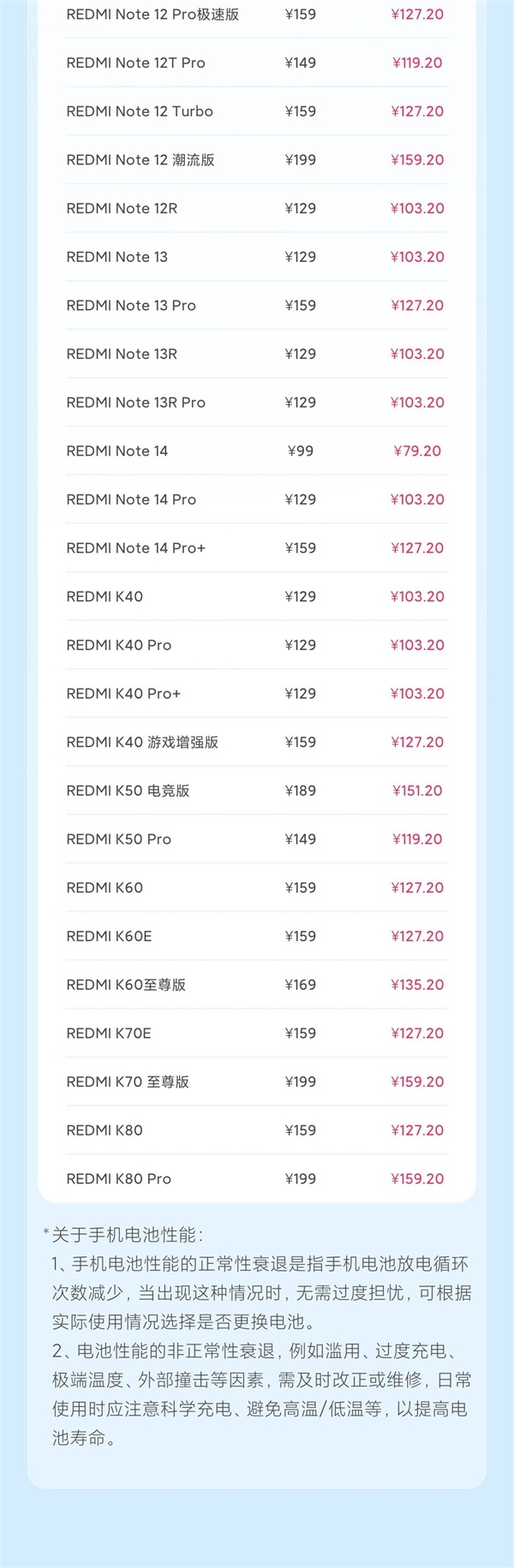 此外,本月參與8折換電池的機型還包括REDMI 10A、REDMI Note9、REDMI K40系列、REDMI K80系列等。