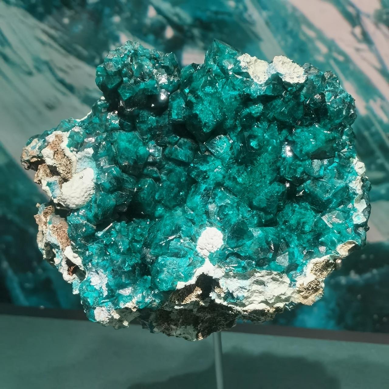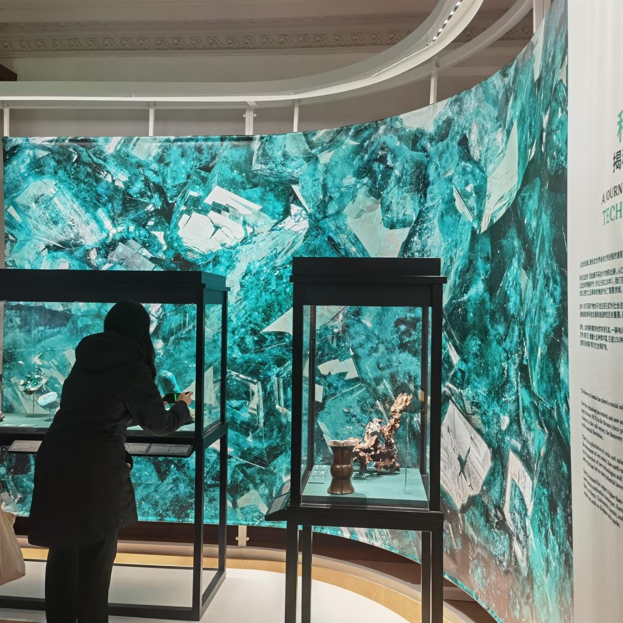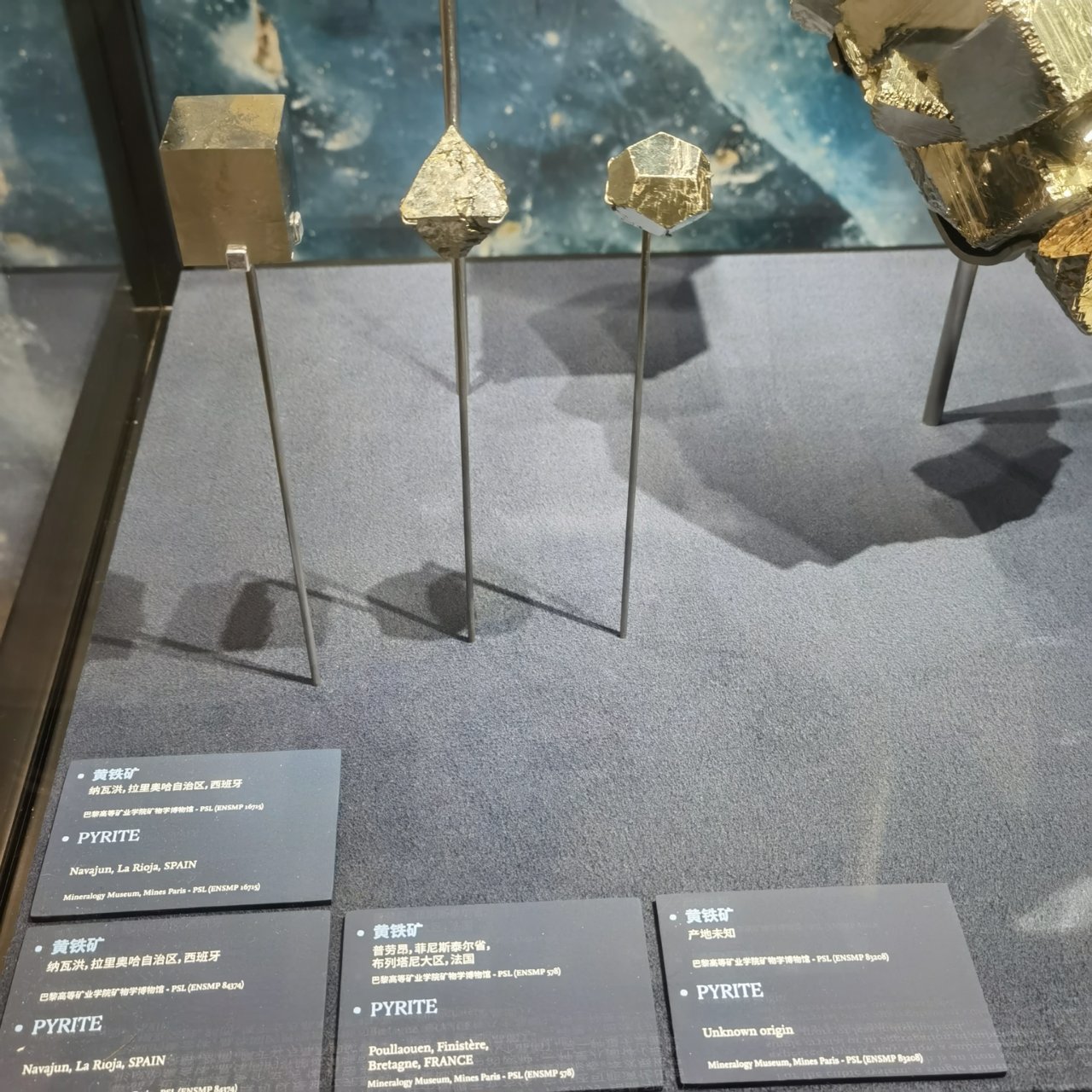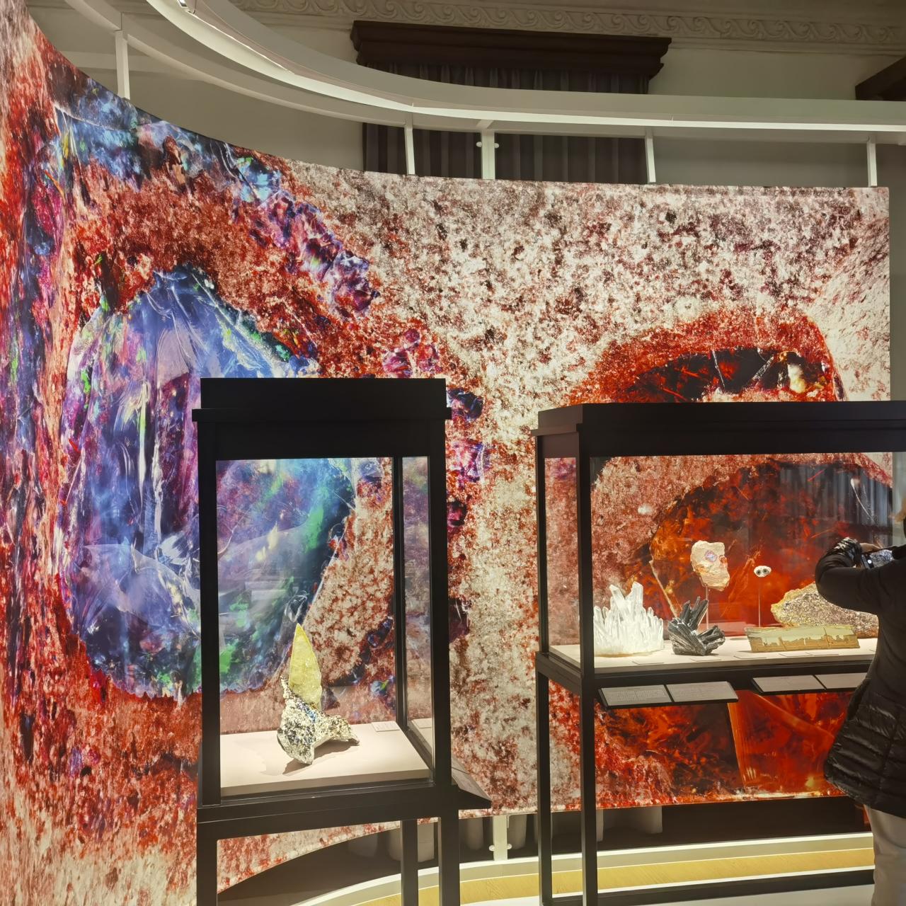 抬頭一看發現展陳背景是這些礦物的微距照片,其實礦物倒是沒有太驚豔我主要還是我看的太多了,這個展陳用本身展覽礦物的微距照片當背景非常驚豔,樓上也有一些礦物晶體模型和球棍模組,以及一些書籍(不過大多數是法文)看不明白。