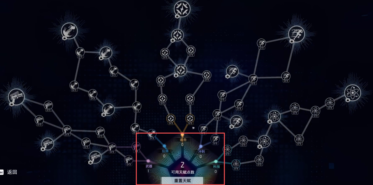而每一个角色又会有独立的天赋数,这些天赋的升级其实还是比我们想象中要复杂的多的,从武器到投掷物到追击甚至是玩家的冲刺移动,都会在这些技能树里面有所反应。