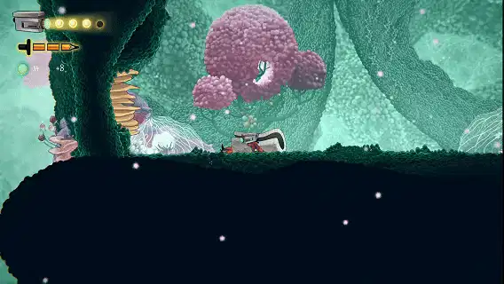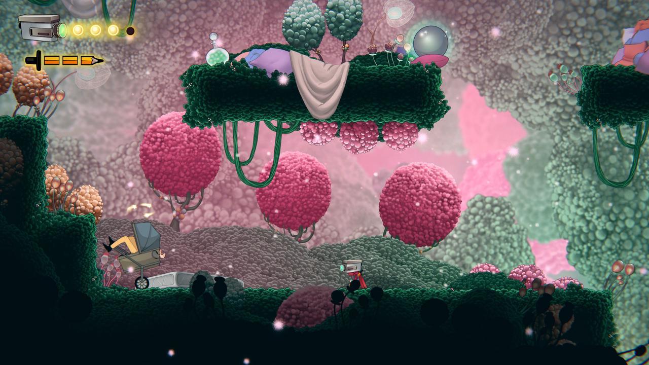 本作并没有像《limbo》《小小梦魇》营造压抑恐惧的氛围,反而以粉、绿、浅紫为主色调,搭配柔和的渐变与细碎的光斑。空中漂浮的光点、随风飘荡的蒲公英絮、粉色的球状植物、没有尖锐的线条,将微观世界放大的柔软森林给人一种梦幻童话的感觉。大可不用管NPC言语,一路边看风景、边跳跳乐、边砍怪直到通关。