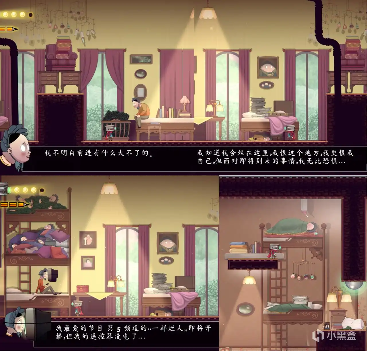 因美术入坑,最后被它的心流叙事所吸引。游戏把我们藏在生活褶皱里的阴暗情绪,放大成了看得见的荒诞剪影——住在婴儿车里、用纸箱罩住自己、把自己关进笼子里、用无数枕头包裹自己。