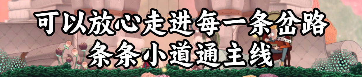 有手就行的平台跳跃、可以避开的普通怪,降低跳跳乐的难度,减少玩家的死亡成本,鼓励我们探索所有地图分支。每一个角落必有奖励,每一条岔路必有捷径/回路。不用急于主线推进,只需要一路把图舔完,就能触发剧情。