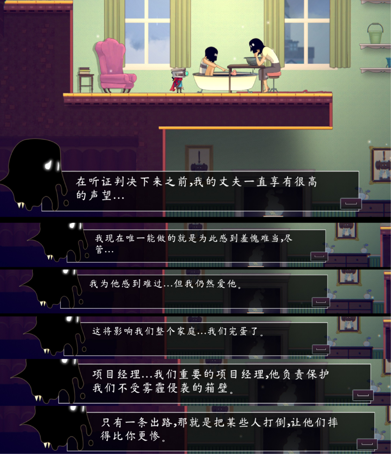 本作中没有残肢、血腥、畸形怪物,大部分敌人都是人形。正因为似人非人,所以更加诡异恐怖。每一个区域的人都是某一种负面情绪的具象化,整款游戏就是大型人类观察室。