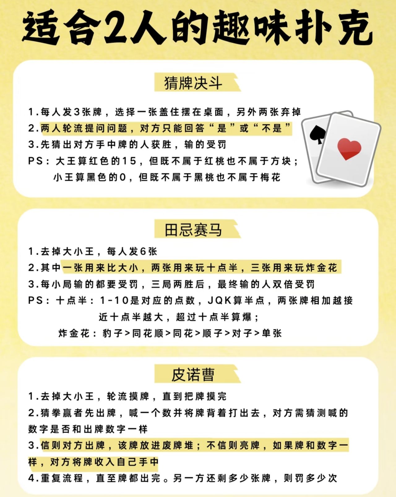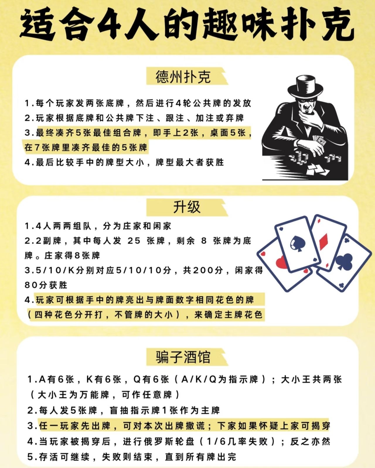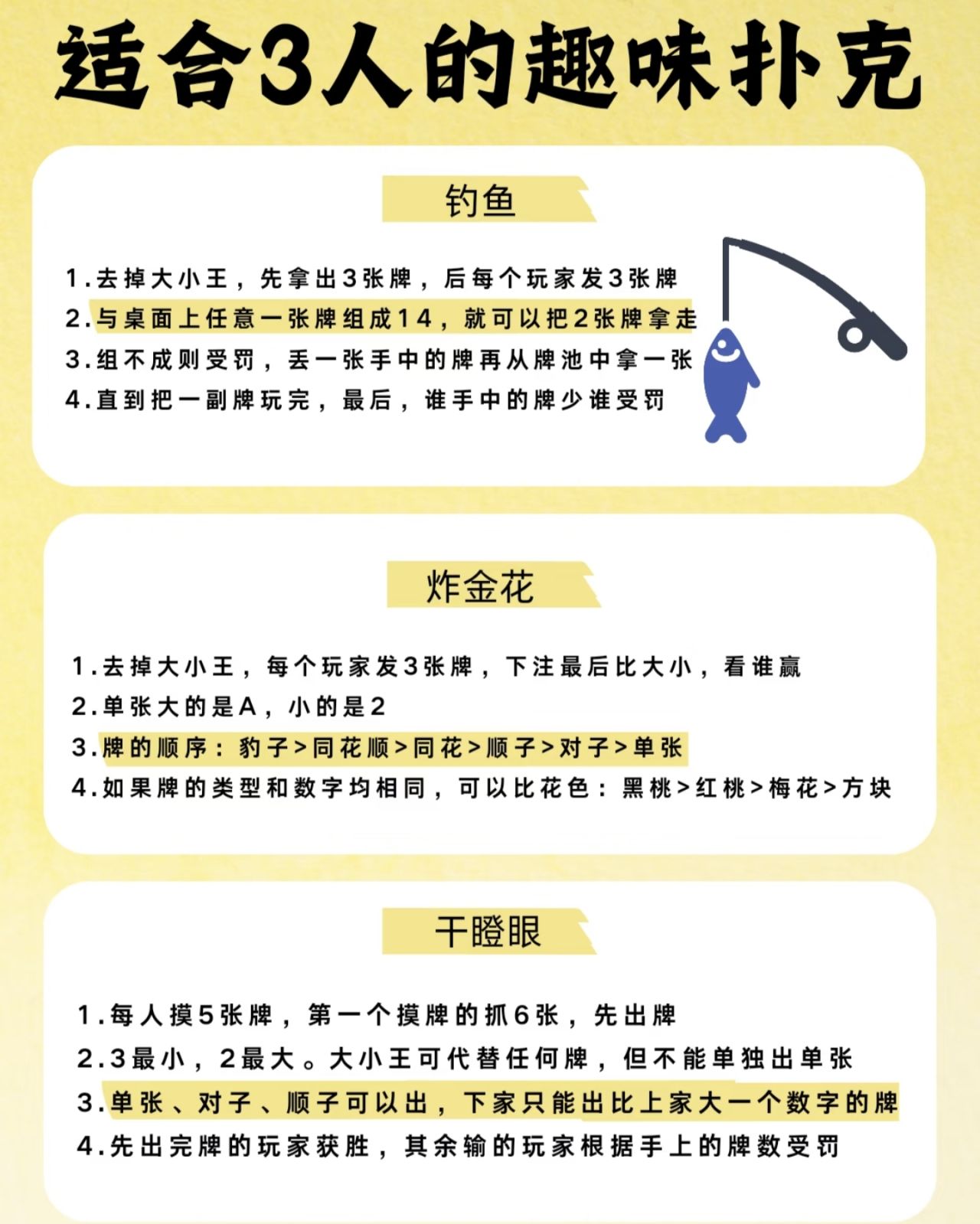 今天給大家帶來的是撲克牌經典玩法,這些都是過年全家聚會時超實用、老少都能玩的款式,不用複雜道具,一副牌就能熱鬧一整晚。不管是和長輩休閒對弈,還是和同輩、晚輩一起放鬆,這些規則簡單、上手極快的玩法都能快速活躍氣氛,不用糾結複雜計分,也不用在意輸贏,主打一個輕鬆開心。