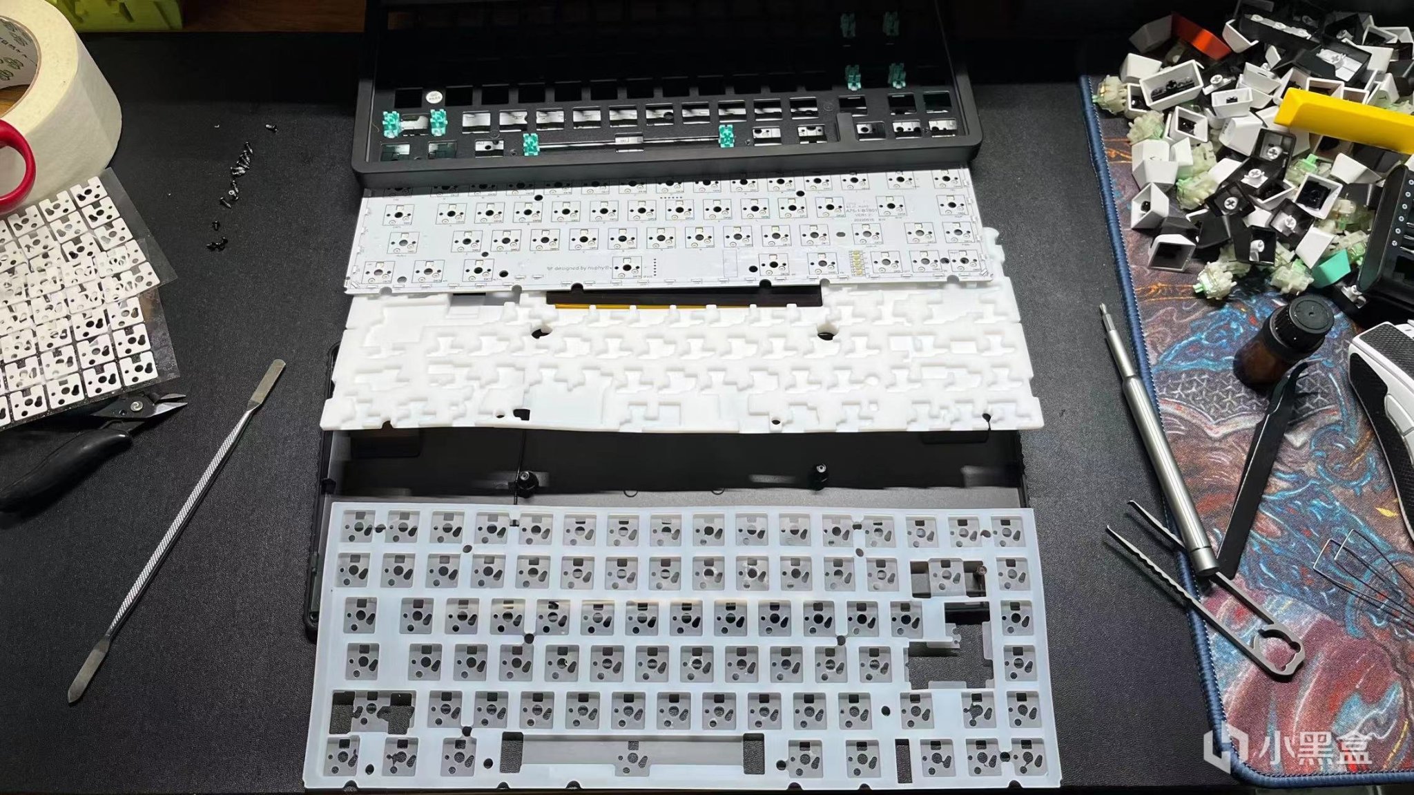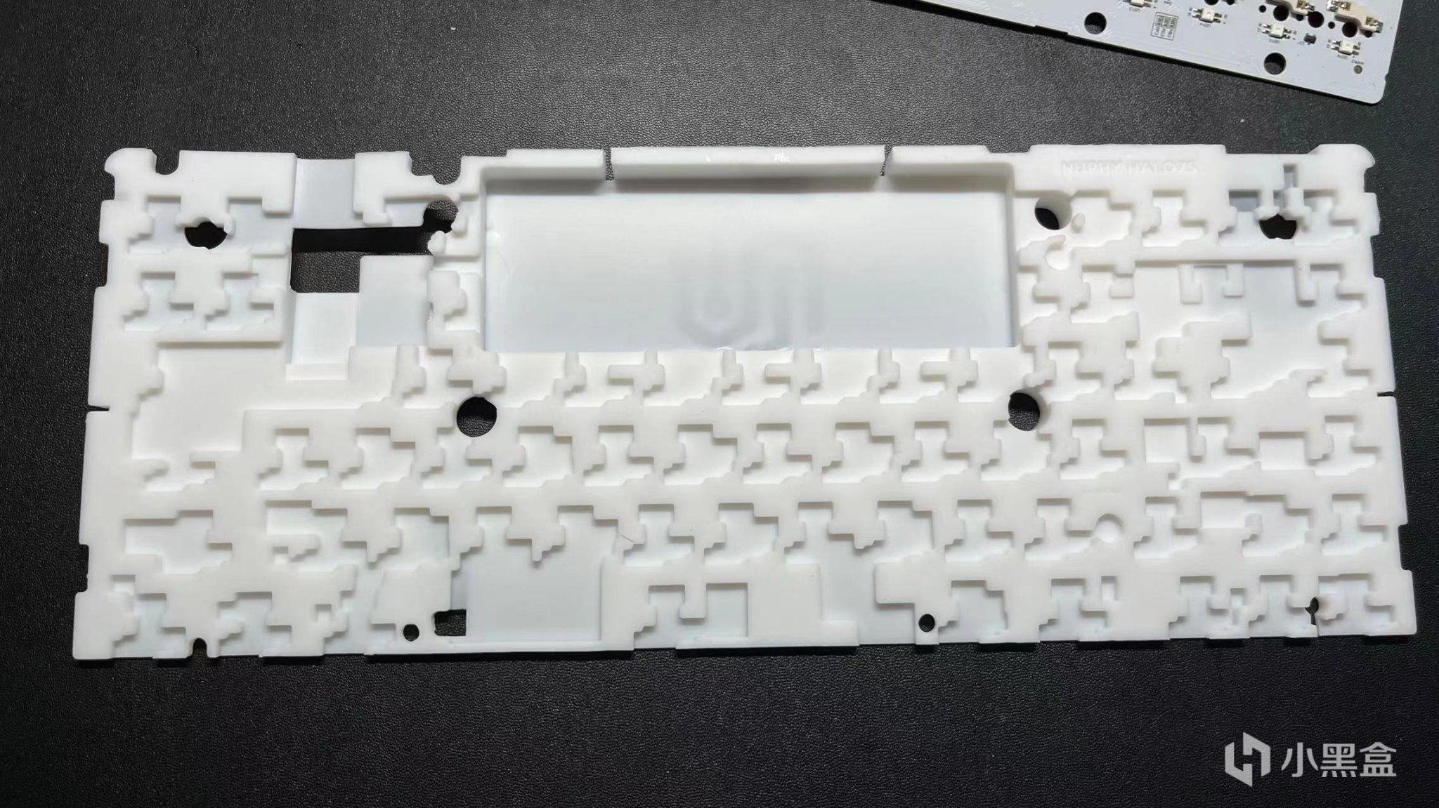 上盖采用螺丝固定的方式将定位板固定在键盘的上盖上面,这就是一个经典top结构的键盘。