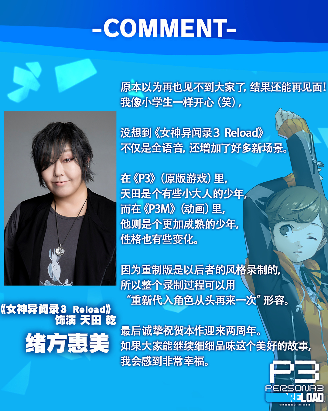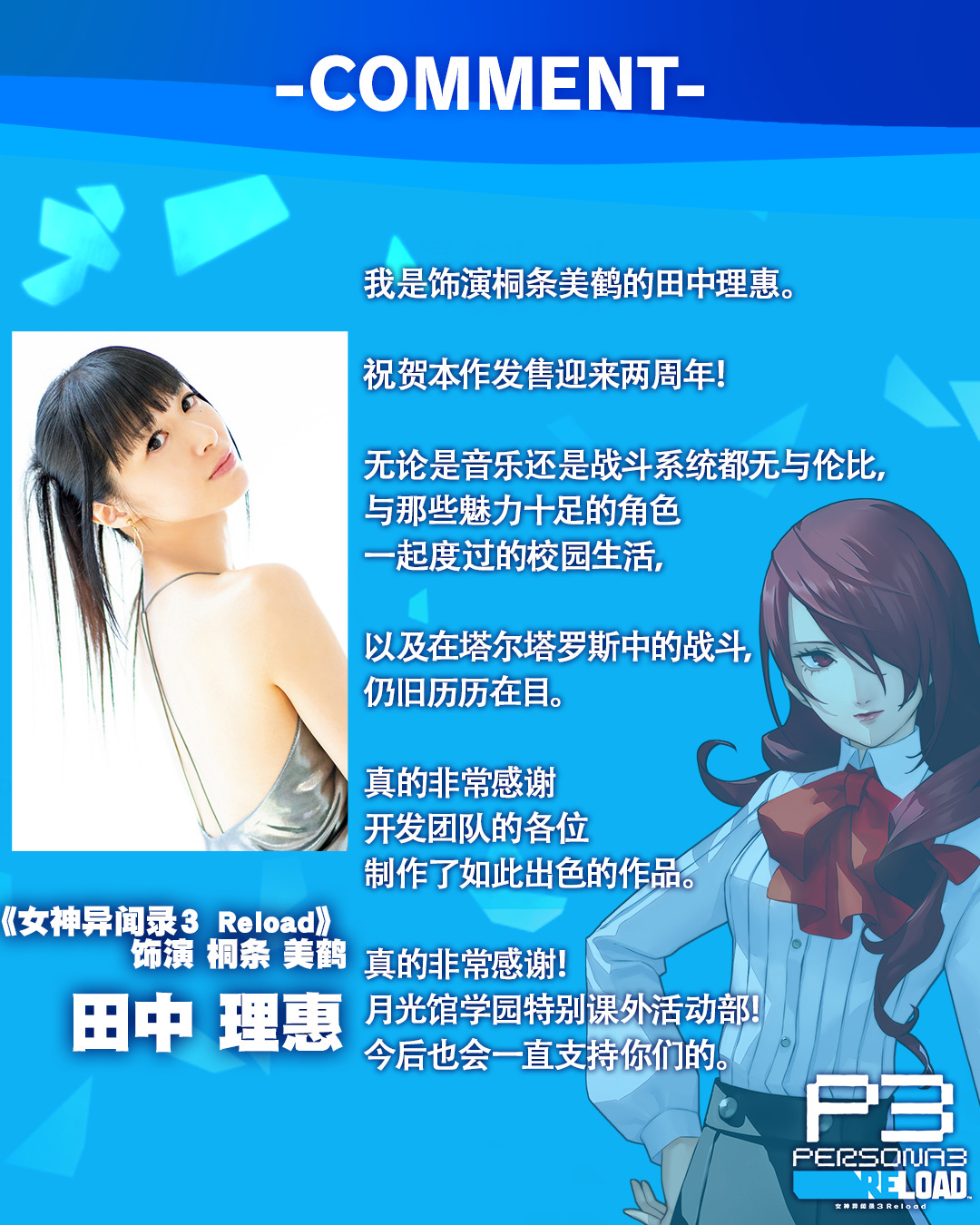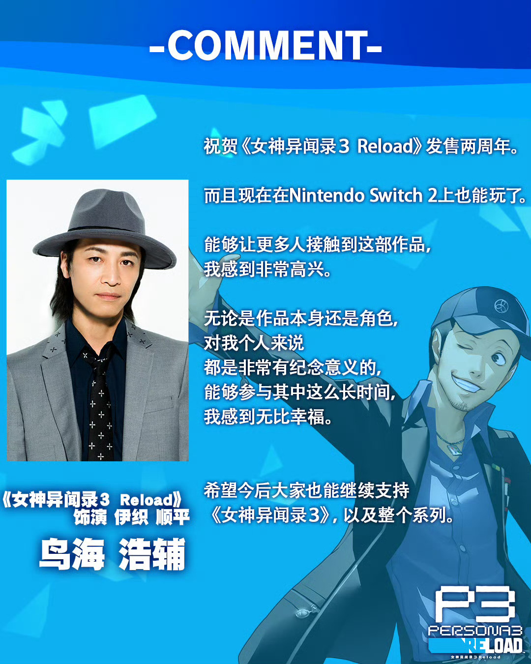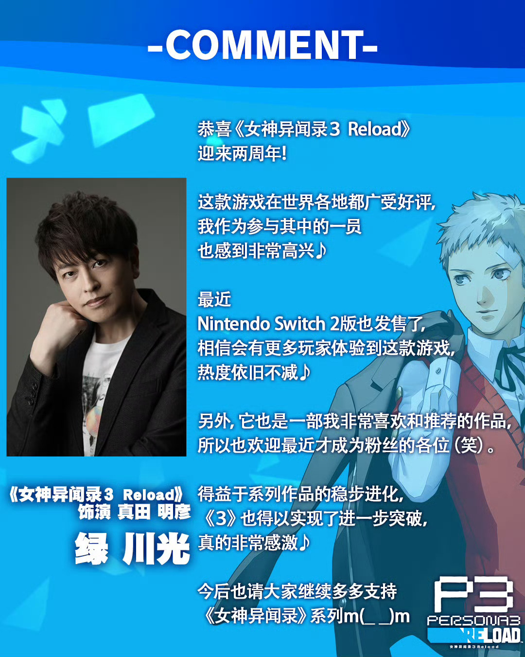 为庆祝《女神异闻录3 RELOAD》发售2周年,Atlus公开了由角色设计师「嶋田あずさ」绘制的纪念插图。