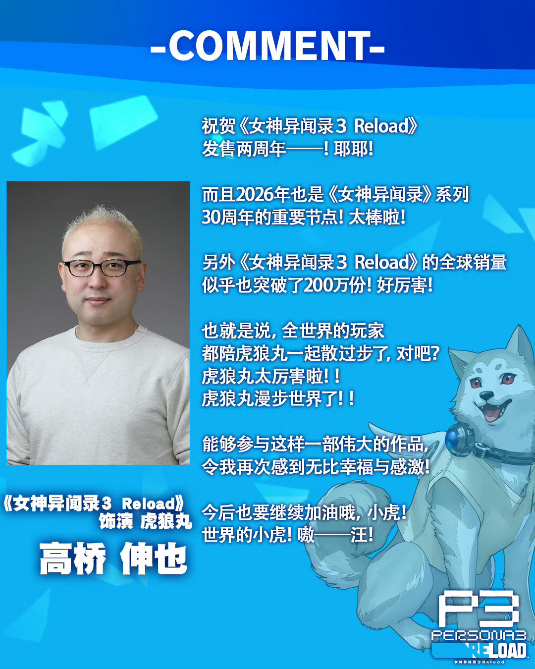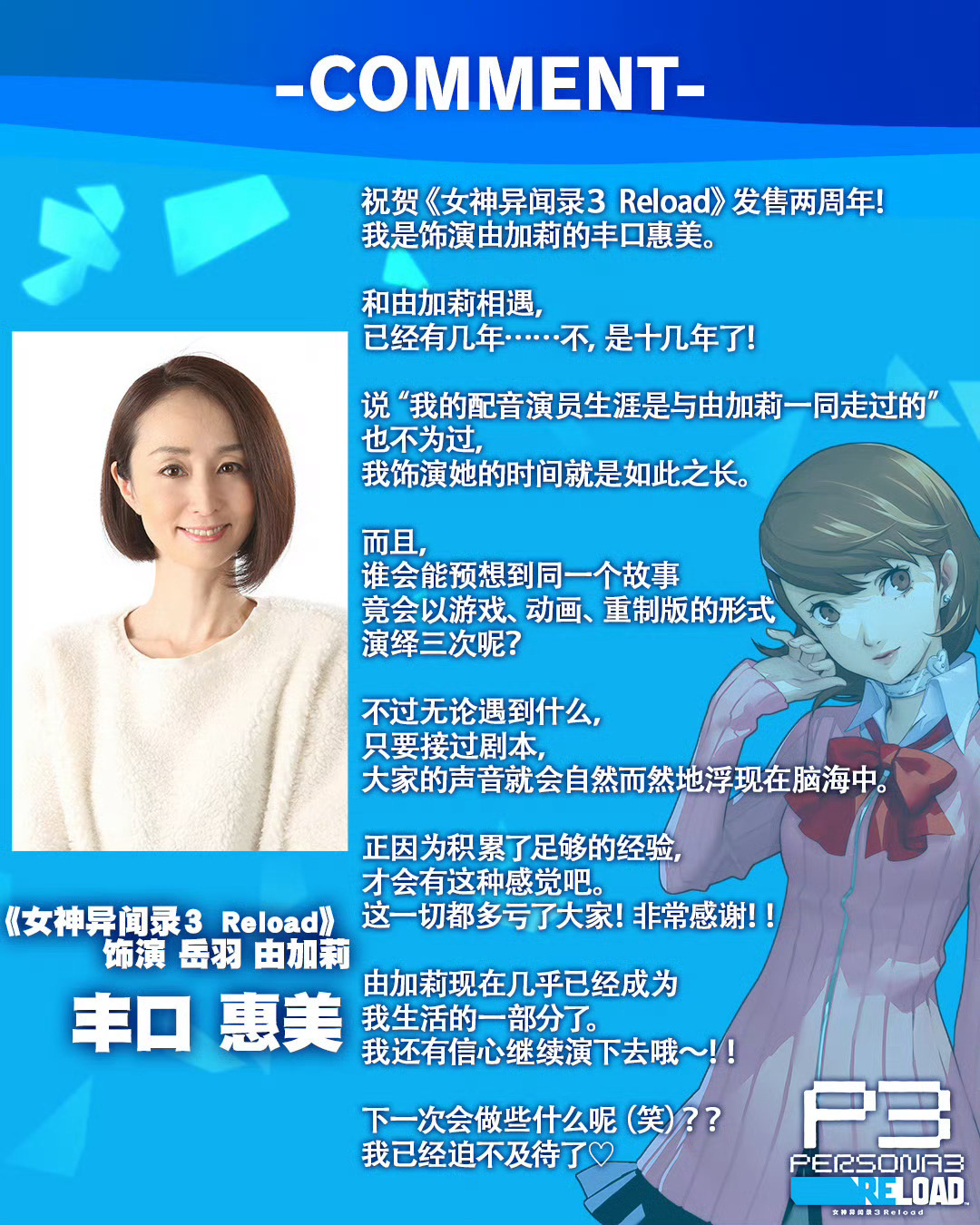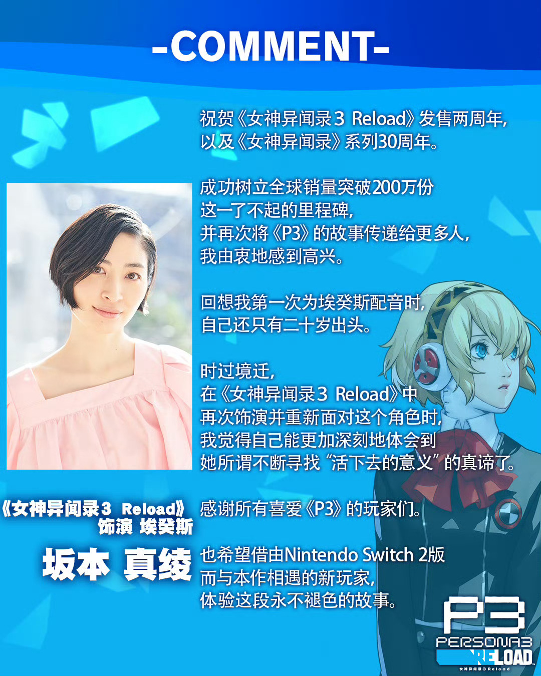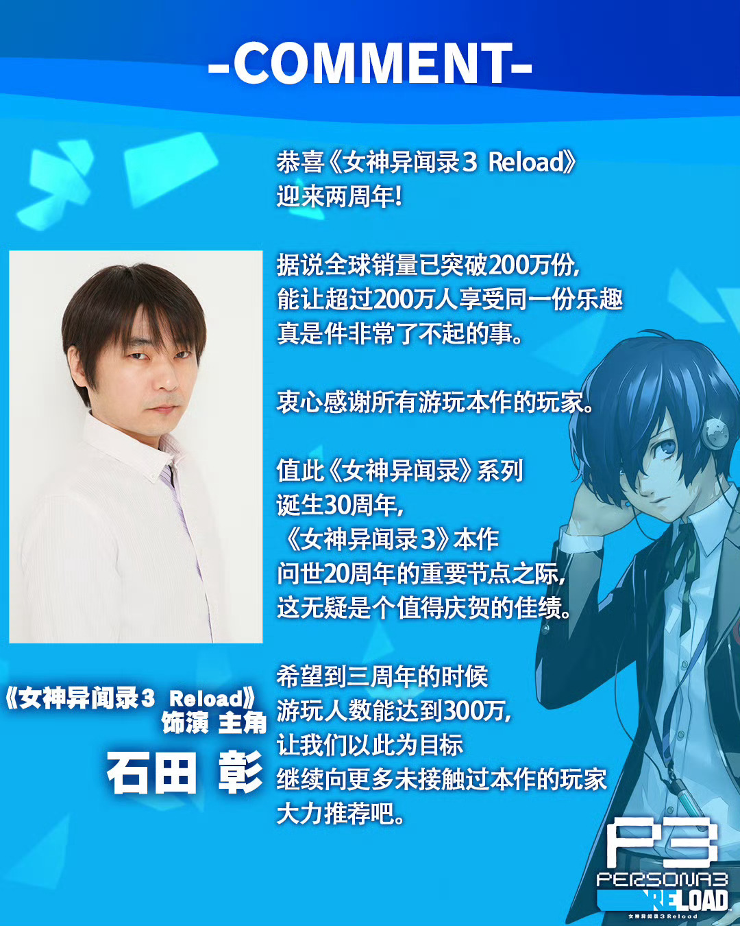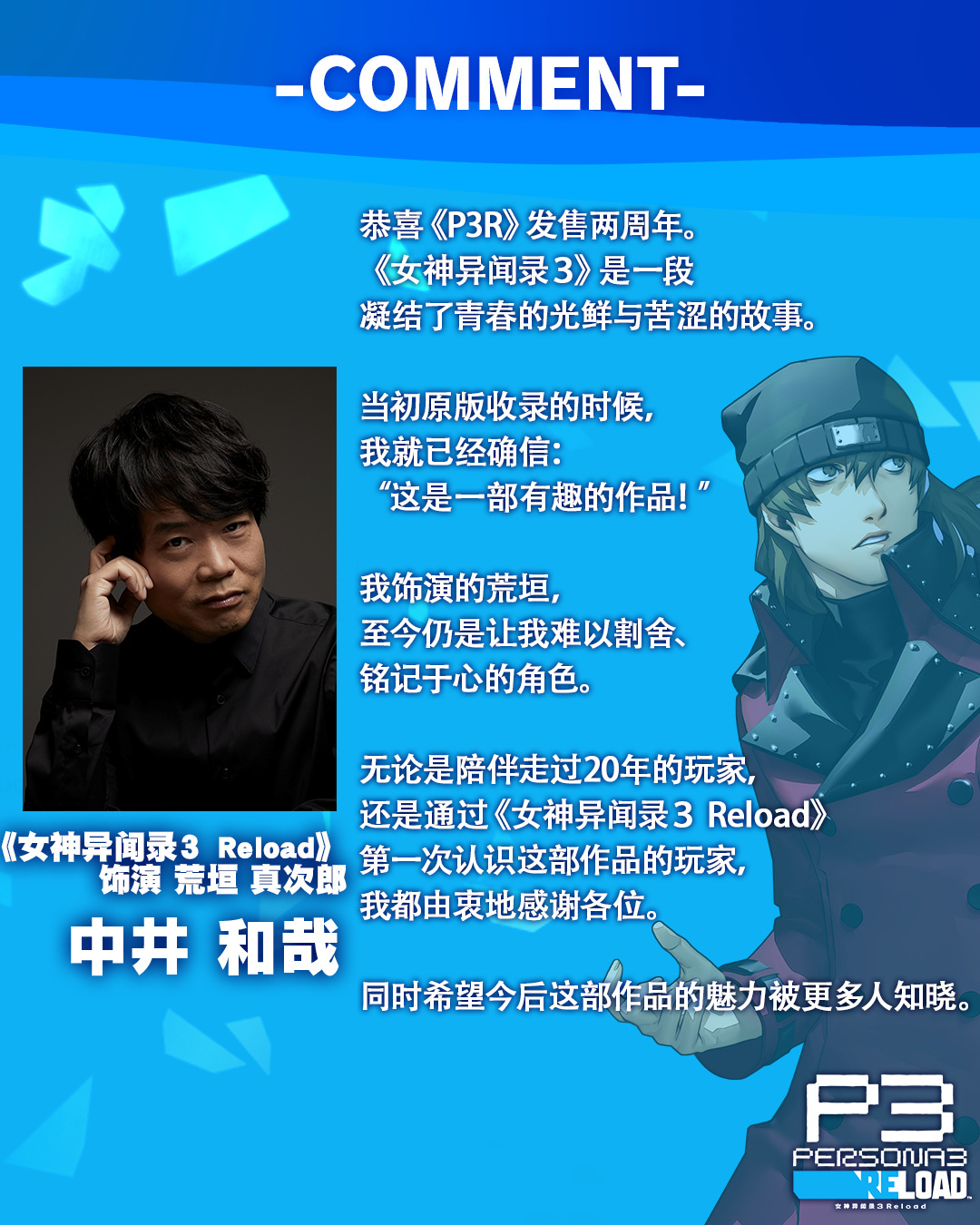 为庆祝《女神异闻录3 RELOAD》发售2周年,Atlus公开了由角色设计师「嶋田あずさ」绘制的纪念插图。