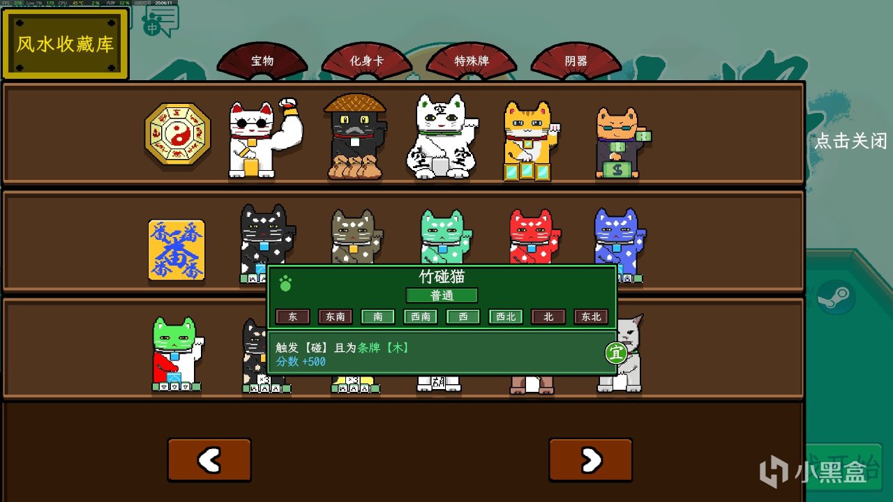 說了半天?我標題的貓貓呢?這不來了,我們在遊戲界面的上方可以裝備各種寶物。而各種寶物裏面,就有各種各樣的招財貓。每隻貓的外貌各不相同,自然帶來的功能也是千奇百怪。例如觸發特定條件就有分數加成的竹碰貓,另外貓貓也要放到適合的位置才能得分最大效益化。