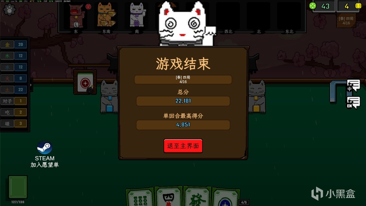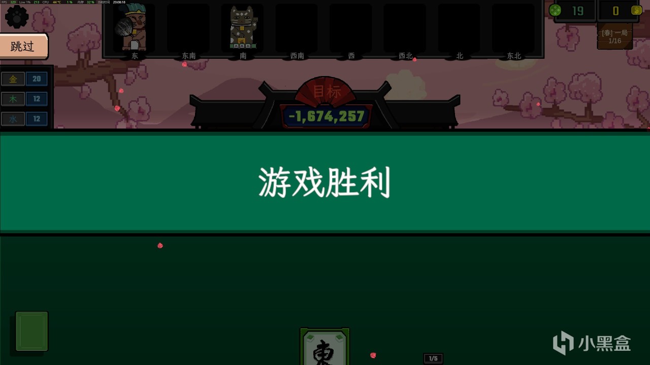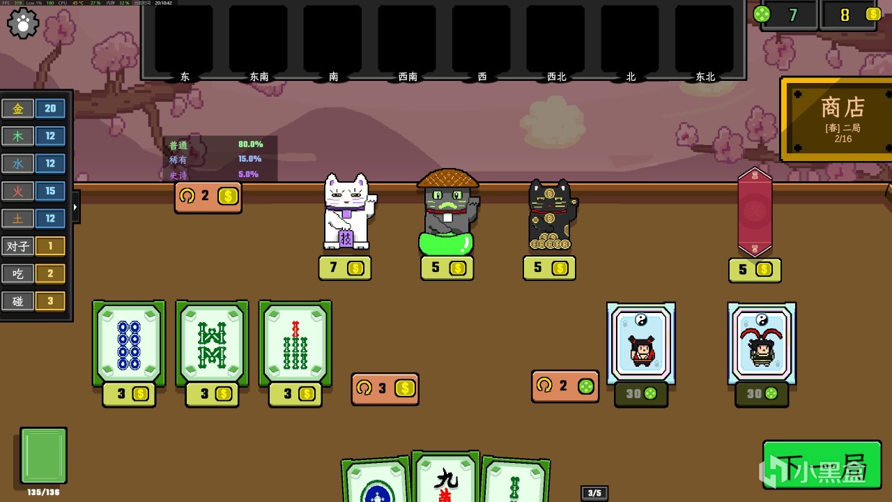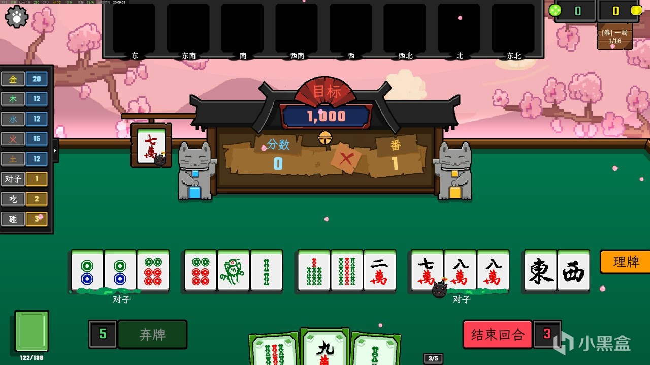 遊戲開始需要選擇遊戲難度和牌組類型,我們循序漸進即可。遊戲的勝利目標很簡單:就是在固定回合內把牌型搭配加起來的點數,全部都加起來達到固定門檻就可以。而如何搭配就是遊戲的重點,在屏幕的左側你可以看到各種構建的牌型。對子、喫、碰和金木水火土。鼠標移動到上面就可以看到,我們就是挑選加成最大的牌型就可以。