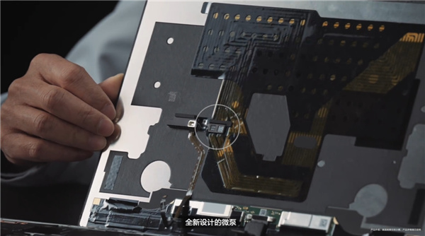 液冷膜的動力來自兩顆全新設計的微泵,依靠壓電陶瓷片的上下振動,源源不斷地驅動流體循環,流量相比上一代直接翻倍。